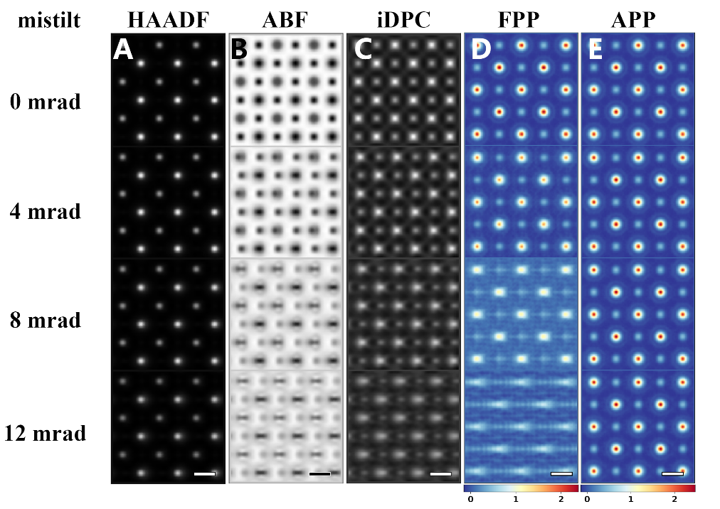 图1. 高分辨成像技术对比。样品为SrTiO3。自上而下晶带轴偏转为0, 4, 8, 12 mrad。HAADF:高角环形暗场像;ABF:环形明场像;iDPC:积分差分相位衬度;FPP:固定传播因子叠层成像;APP:自适应传播因子叠层成像(新方法)