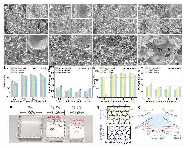 AG(中国)AG·官方网页版网12月9日电 泡沫陶瓷作为一种高气孔率的陶瓷,在干燥与烧结过程中的收缩率非常大,一般可超过50%,一直以来是陶瓷界的一大难题,严重影响了泡沫陶瓷器件的制备与使用。2022年11月,AG(中国)AG·官方网页版材料学院杨金龙教授课题组发现了一种控制泡沫陶瓷干燥与烧结过程收缩率的新方法,利用醇类分子与氧化物表面基团的吸附作用,增强了发泡剂在颗粒表面的吸附量,通过发泡剂分子链的疏水聚集作用,将坯体的收缩率控制在了20%以下。该方法中,醇类分子对体系中表界面的调节作用代替了传统酸碱调节pH值的方法,成为了一种条件温和可控的制备高强度、低收缩泡沫陶瓷材料的新方法。