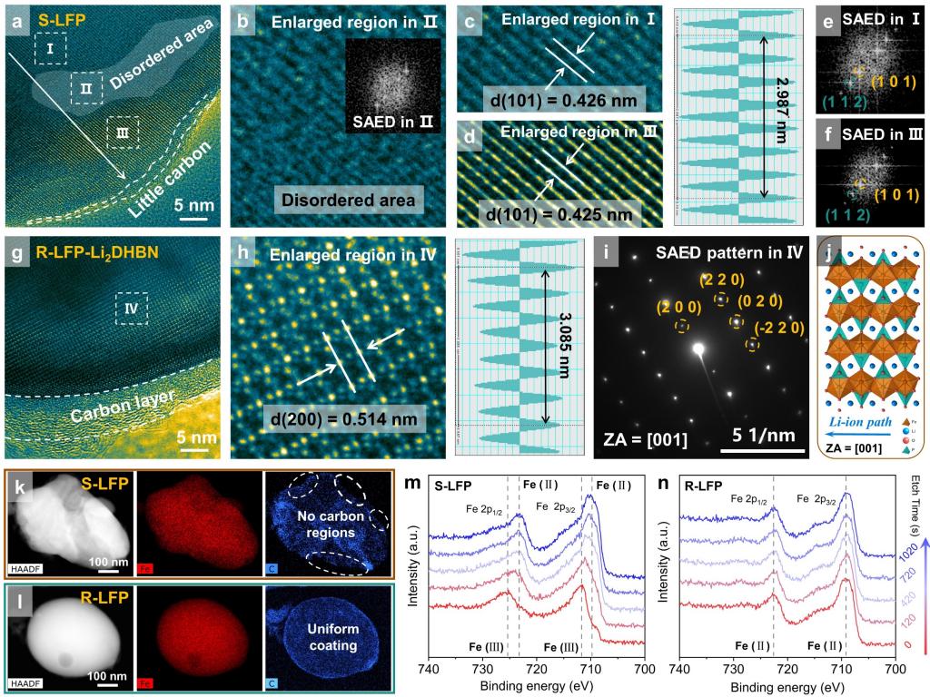 图2. 失效及再生后磷酸铁锂正极材料的微观结构表征