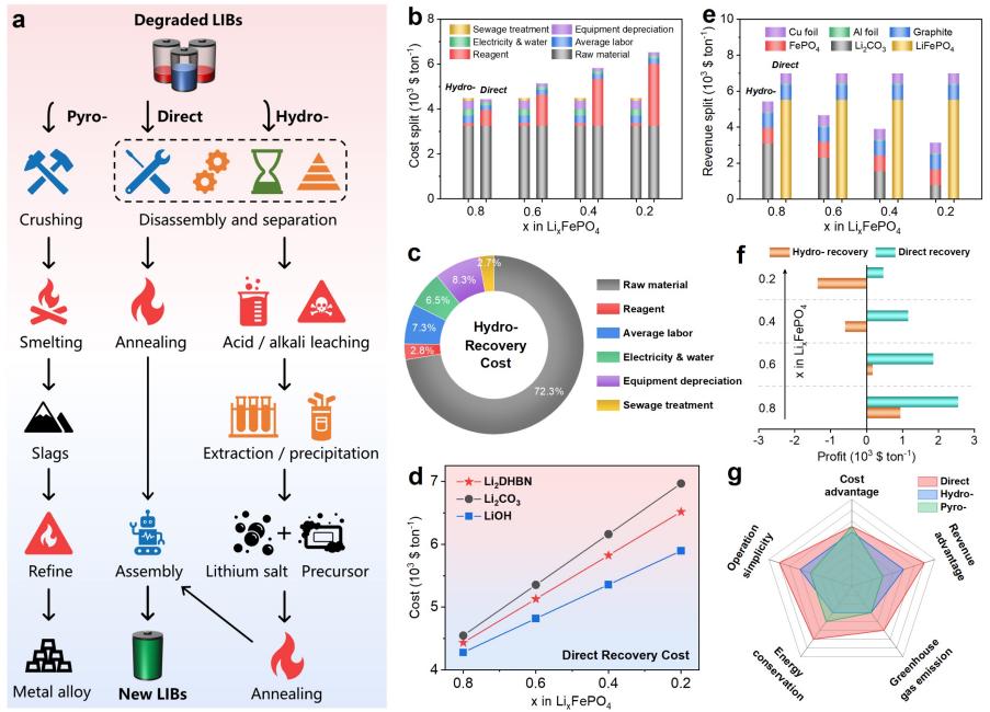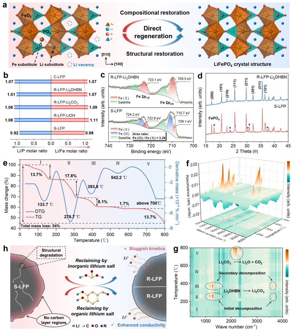 AG(中国)AG·官方网页版网2月12日电 磷酸铁锂(LiFePO4,LFP)电池因其安全性能高、使用寿命长及无模组设计等新兴技术突破而备受关注,被广泛应用于电动汽车和储能电站等领域。随着近些年新能源汽车的爆发式增长,退役锂离子电池的报废量也与日俱增。现行的锂离子电池的回收方法,包括火法、湿法回收等,分别存在着能耗高、使用强酸强碱试剂等问题。因此,研究人员着力探索直接再生回收的思路,在不破坏电极材料结构的基础上,旨在将失效正极材料的成分和结构恢复到原始状态,从而实现废弃锂离子电池的最优化可持续回收。
