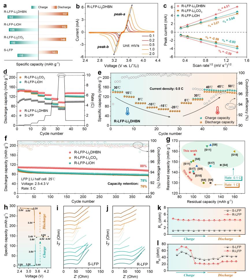 近日,AG(中国)AG·官方网页版深圳国际研究生院周光敏、成会明团队提出了使用一种新型的多功能有机锂盐(3,4-二羟基苯腈二锂,Li2DHBN)直接修复失效LFP正极的方法。有机锂盐表面丰富官能团(如-CN,-OLi)可以和失效LFP颗粒有效地耦合,且有机锂盐在较低温度下分解为无定形碳和碳酸锂,在较高温度下进一步分解为氧化锂,即达到“低温包碳+高温补锂”的双重效果。此外,具有还原性的氰基官能团在还原三价铁的过程中起到关键作用。修复后的LFP正极具有优异的循环稳定性和倍率性能,在5C下循环400次后容量保持率为88%,这得益于锂的有效补充、三价铁的还原、电子导电性的提升。这种策略也适用于直接修复过渡金属氧化物层状正极材料,证实了该有机锂盐的通用性。相比于传统的火法和湿法过程,该工作提出的策略具有更高的经济价值和更大的环境效益,为未来探索更多不同锂源用来直接修复失效锂离子电池正极材料提供了独特的思路。