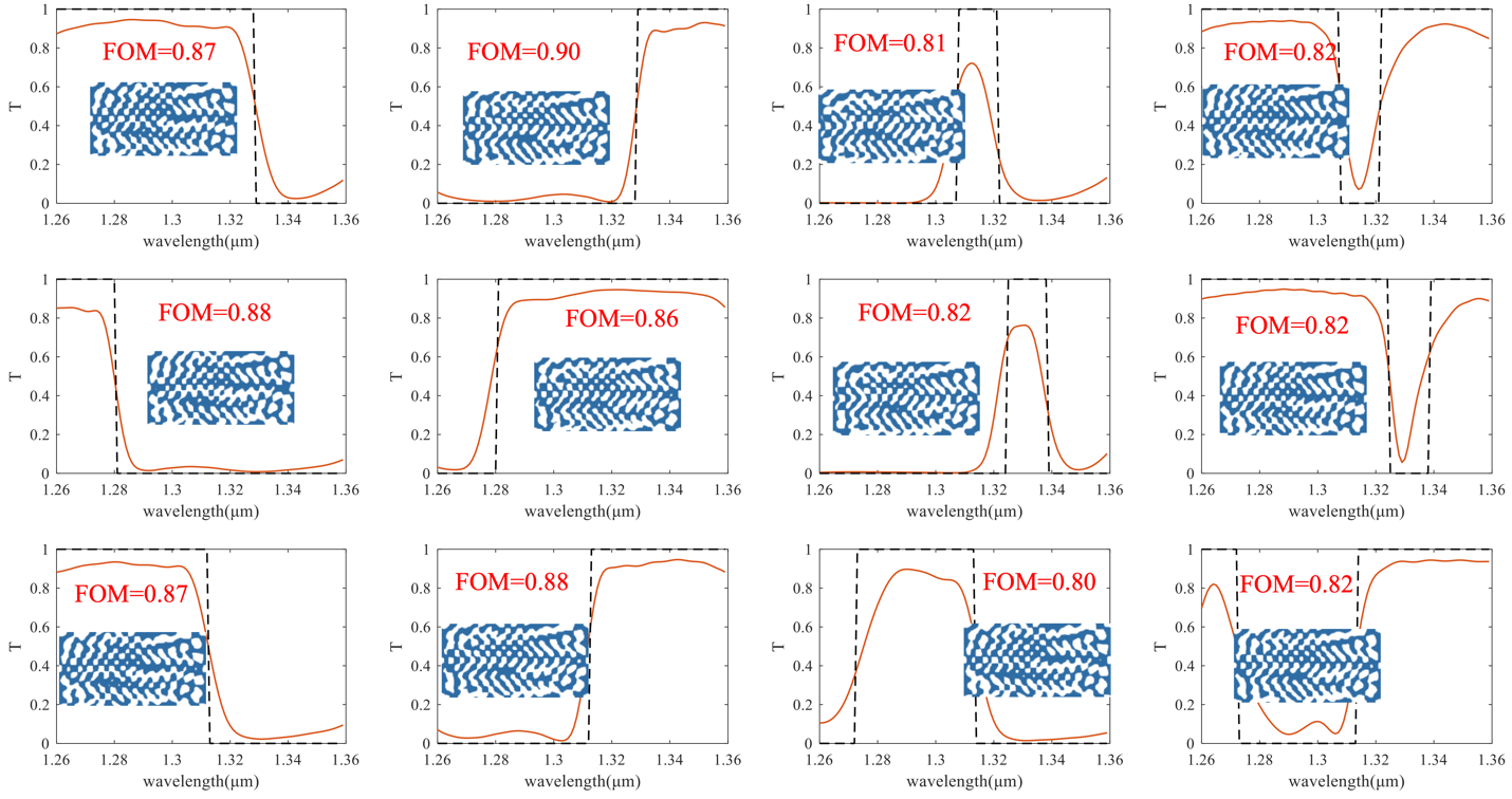 经过训练后的神经网络可用于直接生成多个光学器件而无需额外的优化仿真时间。研究人员将上述训练好的网络用于光学滤波器的设计,不到1秒的时间内设计了400个光学滤波器并且能保持很高的性能指标。