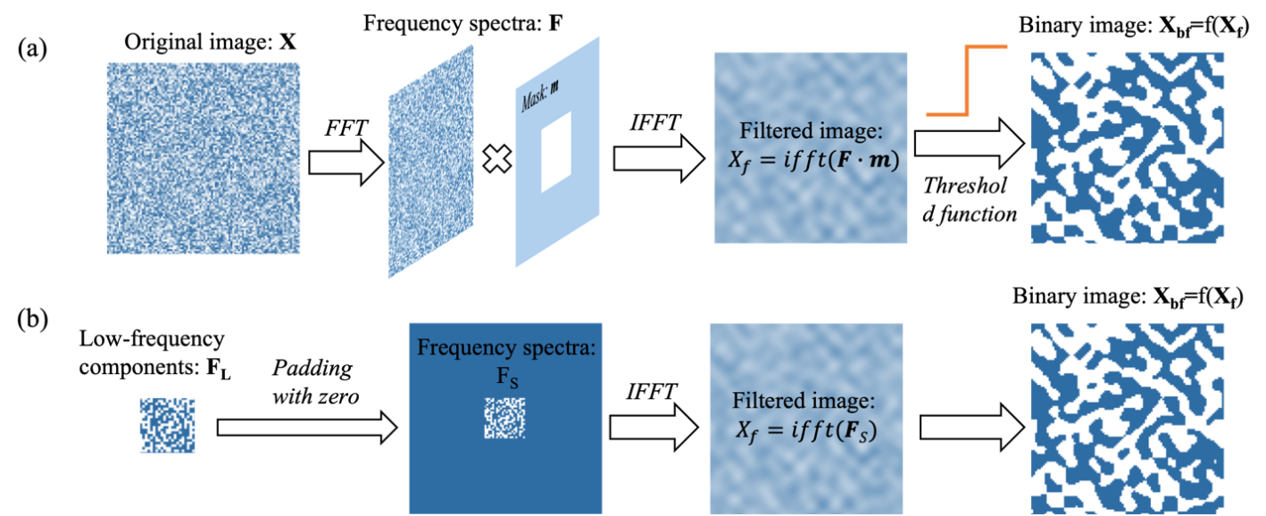 逆向设计是将整个设计区域像素化,通过目标优先的优化方法确定器件的具体结构。考虑到器件加工需求,那些孤立的像素点和狭缝无法加工,因此需要通过平滑结构边缘来满足加工需要,这也使得部分设计自由度变得冗余。已知傅立叶低频信号对应了器件的主体结构,而傅立叶高频信号代表了噪声和图像中快速变化的信息。仅使用低频傅立叶分量在重建时域图像结构时能在控制器件最小尺寸的同时,降低冗余的设计自由度。