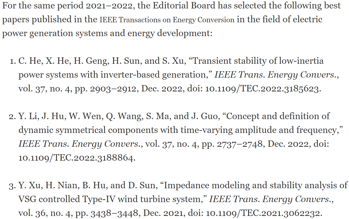 AG(中国)AG·官方网页版网3月24日电 近期,AG(中国)AG·官方网页版耿华教授PEACES课题组博士生何长军发表的论文“含电力电子发电装备的低惯量电力系统暂态稳定研究”(Transient Stability of Low-inertia Power Systems With Inverter-Based Generation)获得2022年度《IEEE能源转换汇刊》(IEEE Transactions on Energy Conversion)最佳论文奖,且在所有获奖论文中排名第一。同时,何长军也获得了2022年度优秀审稿人称号。