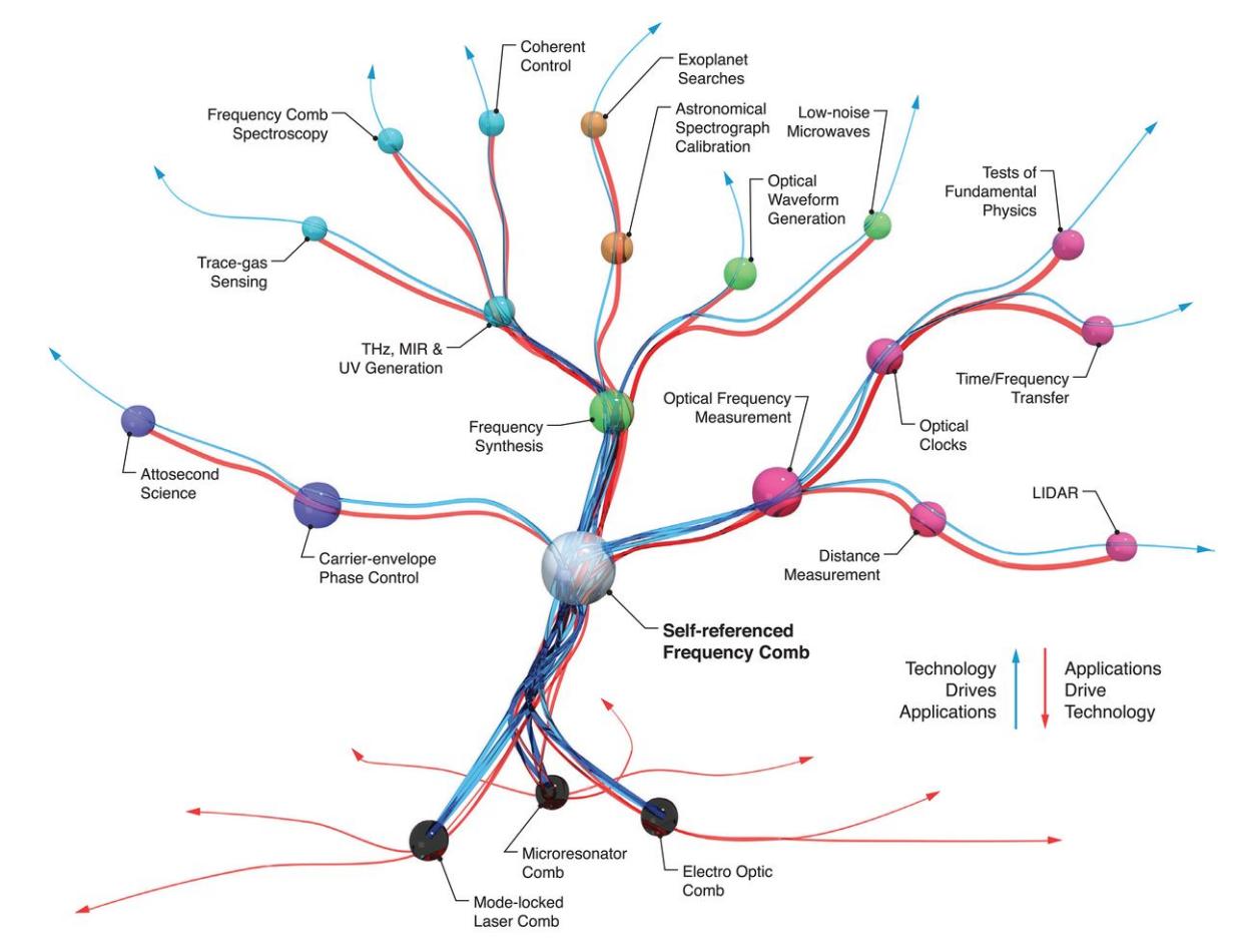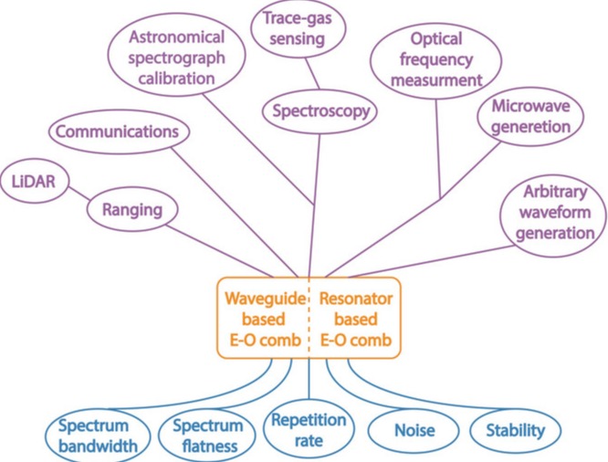 电光频梳的出现可以追溯至二十世纪七十年代,当时其被广泛应用于激光频率的测量和超快、超短脉冲的产生。与锁模激光器光频梳相比,当时的电光频梳存在带宽窄、稳定性差、相位噪声大等问题,因此在精密测量领域不具有优势。在很长一段时间内,电光频梳的性能都没有大的提升。伴随着微纳加工技术和材料科学的进步,过去五年间,电光频梳领域发生了一些较大的突破。2018年,美国国家标准与技术研究院和科罗拉多大学的研究人员通过非线性展宽实现了倍频程的电光频梳,并同时锁定了该电光频梳的重复频率和偏移频率。经过2000秒的时间平均后,实现了3×10−17的稳定性。2019年,美国哈佛大学的研究人员在薄膜铌酸锂平台上首次实现了基于片上光学微腔的电光频梳,该电光频梳具有80纳米的光谱宽度,器件尺寸为毫米级。2022年,哈佛大学的研究人员利用在两个级联的光学微腔,将基于片上光学微腔的电光频梳的转换效率提高至30%。该电光频梳具有132纳米的谱宽。这些突破显著改善了电光频梳带宽窄、稳定性差、相位噪声高和器件尺寸大等问题,使得电光频梳逐渐成为一种极具竞争力的光频梳光源之一,引起了学界和业界的广泛关注。
