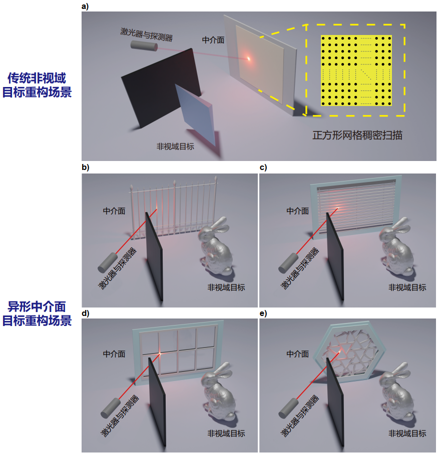 然而,现有的非视域成像技术在应用上存在瓶颈。重建过程依赖于激光照射点在中介面上进行密集、均匀扫描(如图1a所示,通常为上万个扫描点),导致该技术对应用场景要求严格——需要大面积的连续中介面(如墙面、地面等)和较长的采集时间。当实际探测场景可利用的中介面大小及形状严重受限时,将显著加大非视域成像反问题的求解难度,造成现有主流成像算法的重建失败。