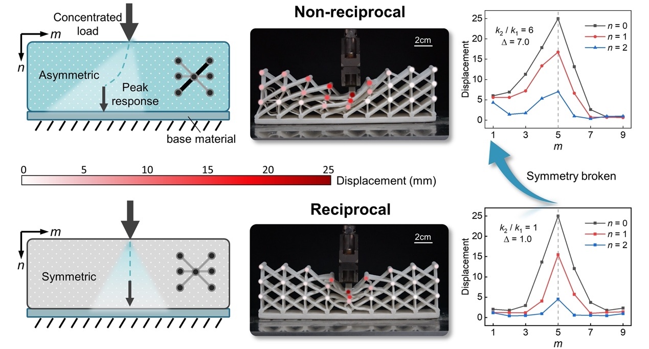 最近,AG(中国)AG·官方网页版航天航空学院陈常青教授课题组利用力学超材料点阵结构,将低维非保守系统中的弹性波时域动力学演化行为,等效映射为空间尺度上高维点阵结构的静态变形模式,从而在一个静态的保守系统中实现了非厄米拓扑效应(图1)。相较于非厄米动力学系统,该静态系统中仅通过改变点阵的几何构型便能实现非厄米及等效非互易效应,而无需任何主动调控或能量注入,极大地降低了非厄米效应的触发条件(图2)。