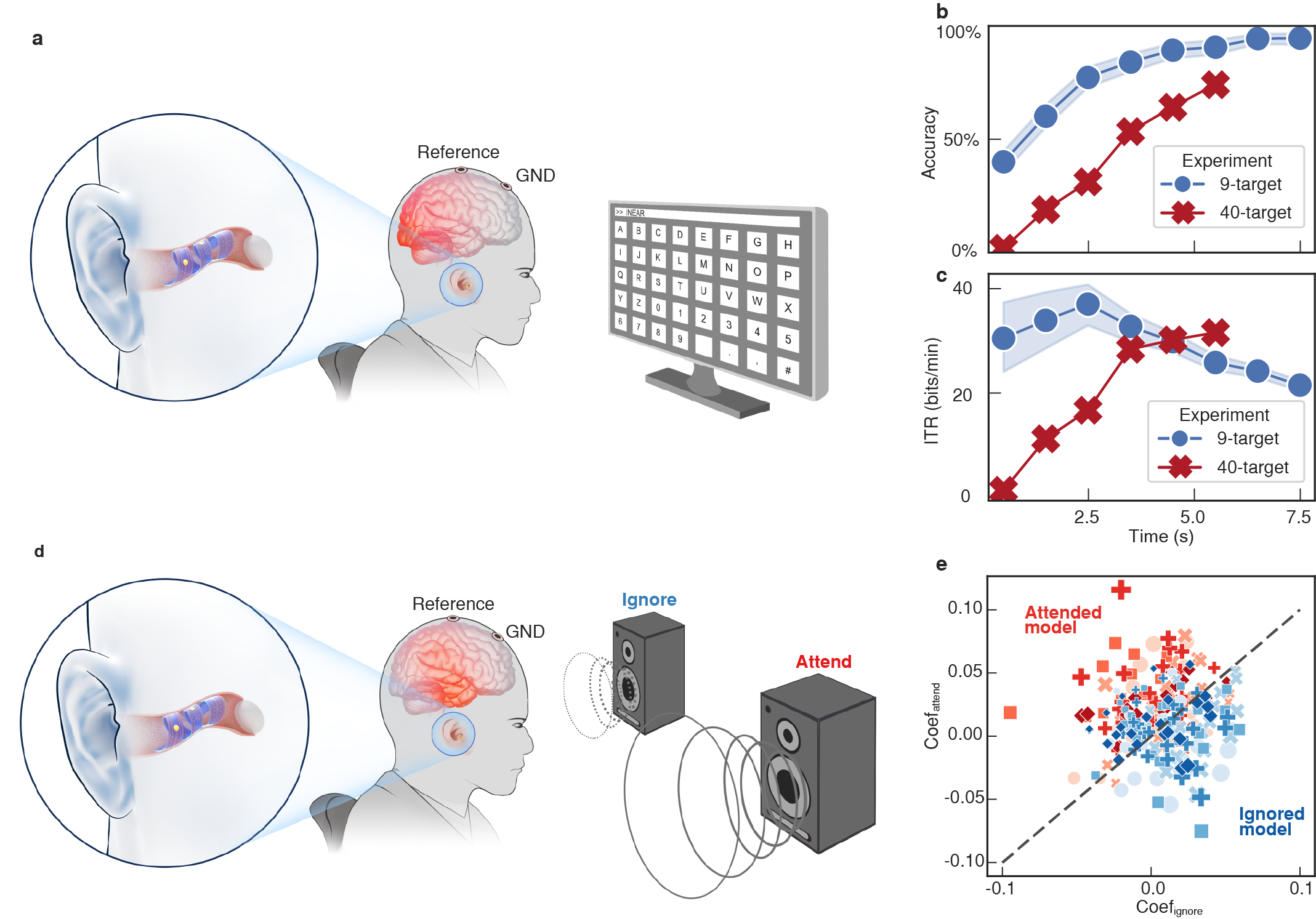 AG(中国)AG·官方网页版网7月24日电 7月14日,AG(中国)AG·官方网页版柔性电子技术实验室、航天航空学院冯雪教授课题组与医学院高小榕教授课题组合作,在《自然·通讯》(Nature Communications)期刊上在线发表了题为“用于视觉和听觉脑机接口的入耳式共形生物电子器件”(Conformal in-ear bioelectronics for visual and auditory brain-computer interfaces)的研究成果。该论文提出了一种耳内的柔性三维附壁攀爬神经电子器件,开展了基于稳态视觉诱发电位和鸡尾酒效应的视觉及听觉脑机接口(BCI)研究,展示了其在神经脑科学领域的广阔应用前景。