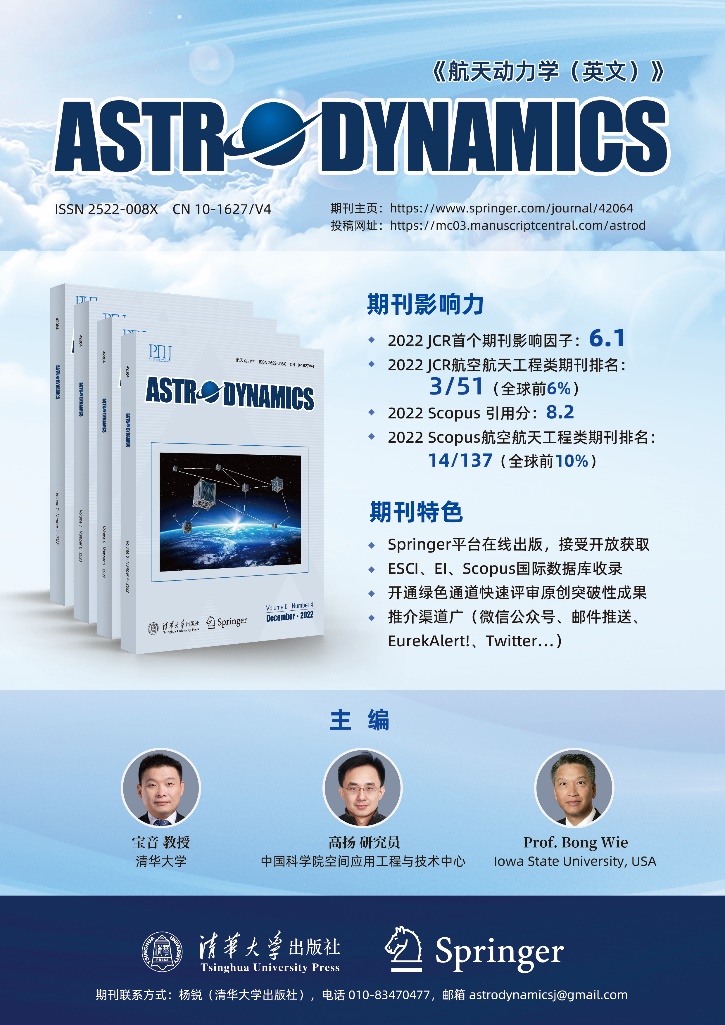 《航天动力学(英文)》(Astrodynamics)创刊于2017年9月,由AG(中国)AG·官方网页版主办,航院提供学术支撑,AG(中国)AG·官方网页版出版社出版,Springer公司负责海外发行,AG(中国)AG·官方网页版航院教授宝音、中国科学院研究员高扬、美国爱荷华州立大学教授魏烽(Bong Wie)等三人共同担任主编。目前,该刊拥有由31位国内、国际专家学者组成的编委会,其中国际编委17人(55%)。国内编委主要是活跃在该领域的年富力强的中青年学者,AG(中国)AG·官方网页版航院教师宝音、蒋方华,以及龚胜平、姜宇、曾祥远等航院校友均具有在该领域国际顶级期刊发表过高水平论文和参加我国航天工程重大项目的经历。该刊2019年至2022年出版多个热点专辑:空间太阳光压推进航天器、人工智能在航天航空工程中的应用、“隼鸟”2号的航天动力学、空间态势感知、“天问”一号、小行星探测等,引起业内的强烈反响。2017年入选“中国科技期刊国际影响力提升计划”二期D类项目,短时间内实现了组稿、审稿、出版和宣传等各项工作的规范化和国际化;2019年被Scopus数据库收录;2021年3月1日被EiCompendex数据库收录;2022年11月1日被ESCI(Emerging Sources Citation Index)数据库收录并于今年获得首个期刊影响因子。