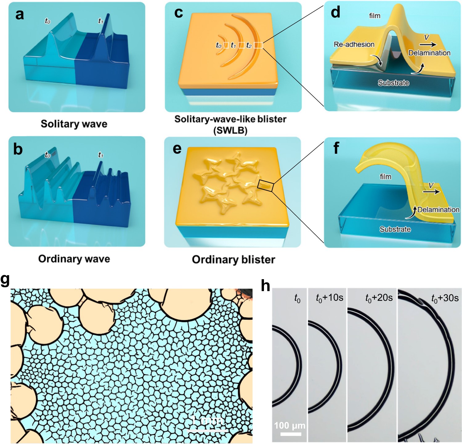 图1.SWLB变形模式和普通屈曲模式的示意图及形貌图。(a-b)水中孤立波和普通水波的示意图。(c-d)SWLB变形模式及其截面轮廓的示意图,其中薄膜-基底界面存在脱层(Delamination)和重新粘附效应(Re-adhesion)。(e-f)普通屈曲模式及其截面轮廓的示意图,其扩展尖端的薄膜-基底界面发生脱层(Delamination)。(g)SWLB和网络状屈曲的光学形貌伪彩图,其中橙色是SWLB区域,而蓝色是网络状屈曲区域。(h)单个SWLB传播过程中的形貌变化