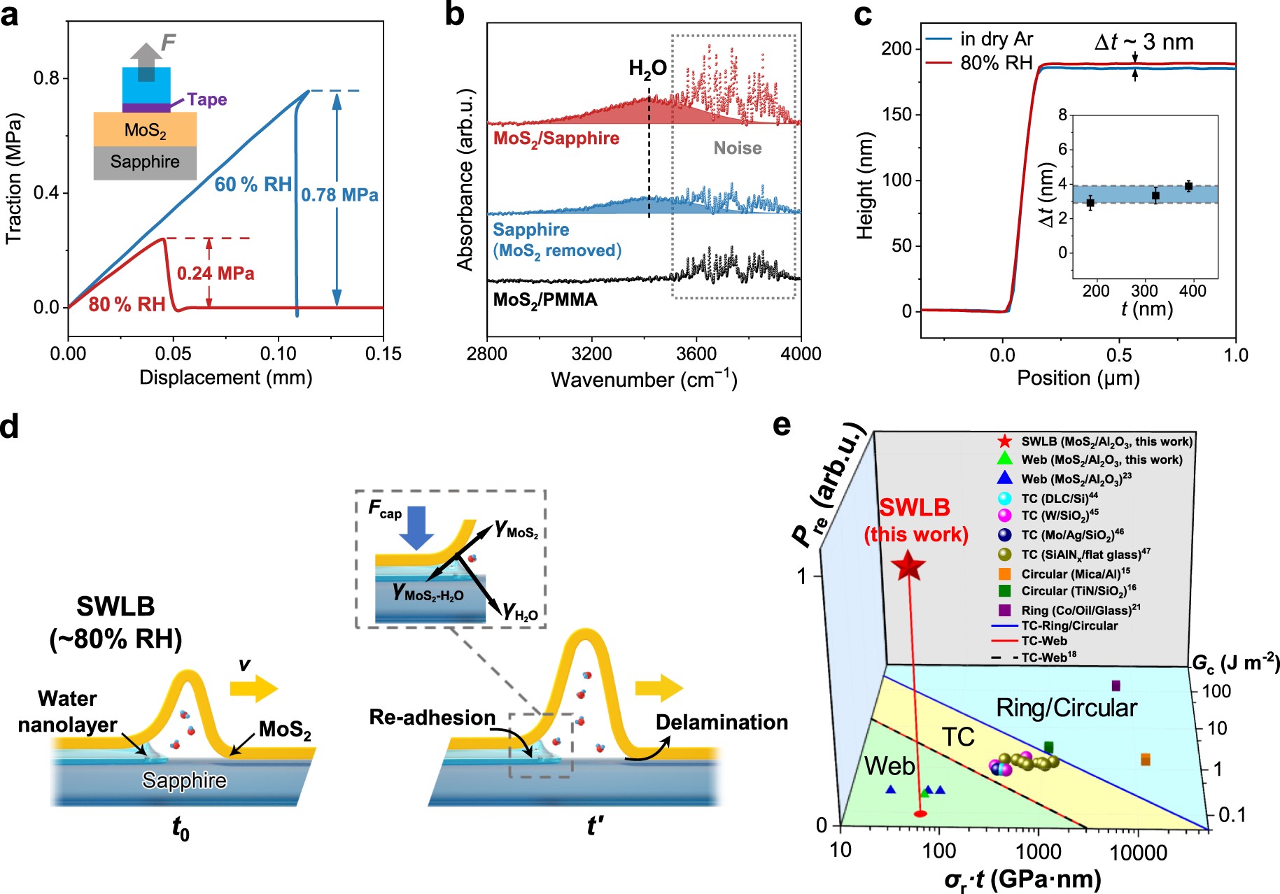 图3.湿度及界面纳米水膜在SWLB形成中的作用。(a)不同湿度下原位力学测试得到的拉力-位移曲线。(b)高湿度(~80% RH)下ATR-FTIR测得的吸光度曲线,证明MoS2/Sapphire在高湿度下存在界面水膜。(c)AFM测得的在干燥和高湿度条件下MoS2薄膜的高度轮廓,∆t为高度变化量,即为估算的界面水膜厚度。(d)由湿度驱动的SWLB的机理示意图,插图展示了由SWLB后端界面纳米水膜的毛细作用所引起的重新粘附效应(Re-adhesion)。(e)SWLB与其他屈曲模式的对比,其中Gc是界面能,σr是薄膜中的残余应力,t是薄膜厚度,Pre=1表示存在重新粘附过程,Pre=0表示不存在重新粘附过程