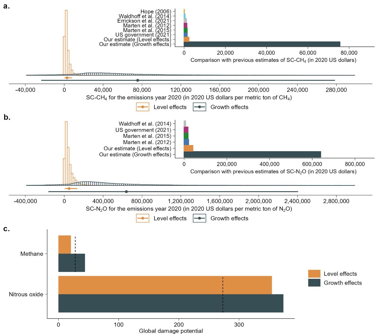 研究结果表明,既往研究低估了SC-CH4和SC-N2O。在仅考虑具有水平效应的损失函数时,CH4和N2O的社会成本(2020年为排放年)分别为2900美元/tCH4和49600美元/tN2O,是之前文献最高估计值的约2倍。而在考虑增长效应后,SC-CH4和SC-N2O的估计值会进一步增加15至25倍(图1)。