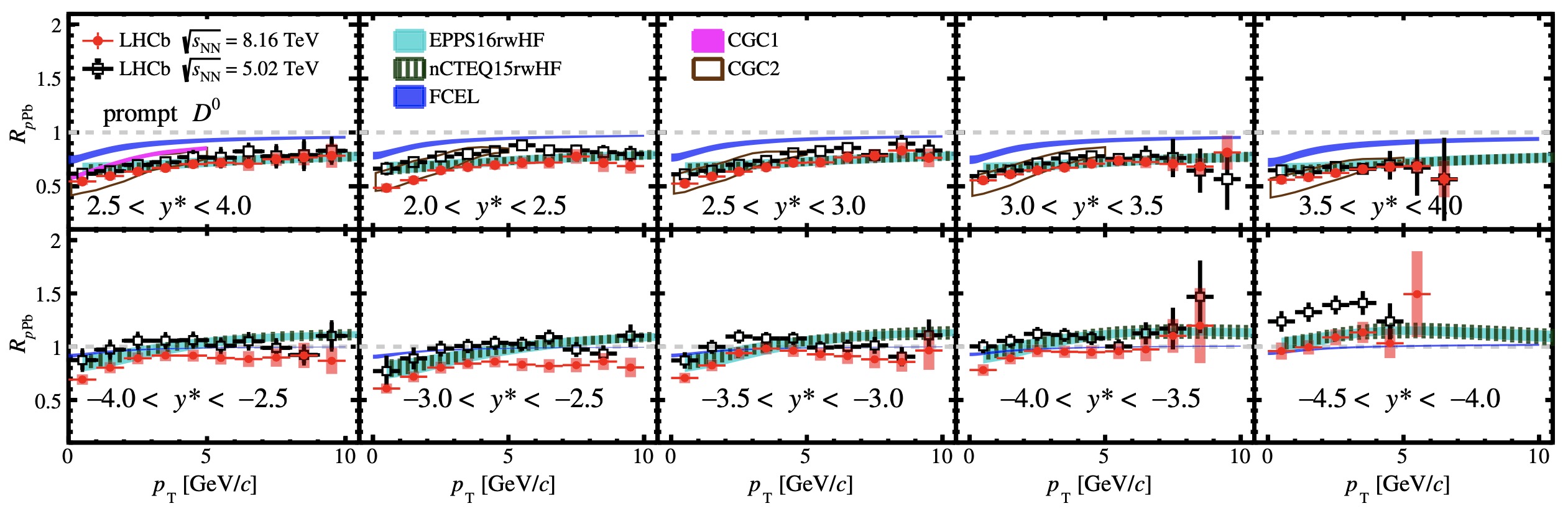 利用LHCb实验在2016年采集的8.16TeV的pPb对撞数据,研究团队精确测量了在该对撞系统中D0介子的产生截面,并通过与质子-质子对撞中产生截面的比较得到了D0介子的核修正因子。实验发现该物理量在前向快度区间存在显著压低,证实了pPb碰撞中冷核物质效应的存在。首次观测到该物理量在后向快度区间的高横动量区相比理论计算存在较明显的压低现象,暗示pPb对撞中可能存在多部分子散射或初、末态能损等其他核物质效应。