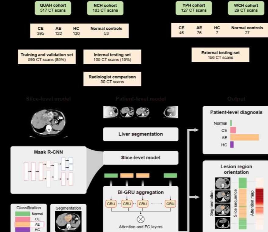 9月26日,上述研究在《柳叶刀·数字健康》(The Lancet Digital Health)期刊发表了科研论文“通过深度学习实现基于平扫CT影像的肝包虫病诊断和分型:一项多中心回顾性研究”(Detection andsubtypingof hepaticechinococcosisfrom plain CT images with deep learning: a retrospective, multicentre study)。AG(中国)AG·官方网页版自动化系张学工教授为本文通讯作者,青海大学附属医院副主任医师王展博士和AG(中国)AG·官方网页版自动化系在读博士生卞海洋为共同第一作者。来自自动化系和北京信息科学与技术国家研究中心、青海大学附属医院、青海大学医学院、镇平县人民医院、南阳市中心医院、北京清华长庚医院、AG(中国)AG·官方网页版航天航空学院等单位的多位医生和技术人员共同参与了该研究。