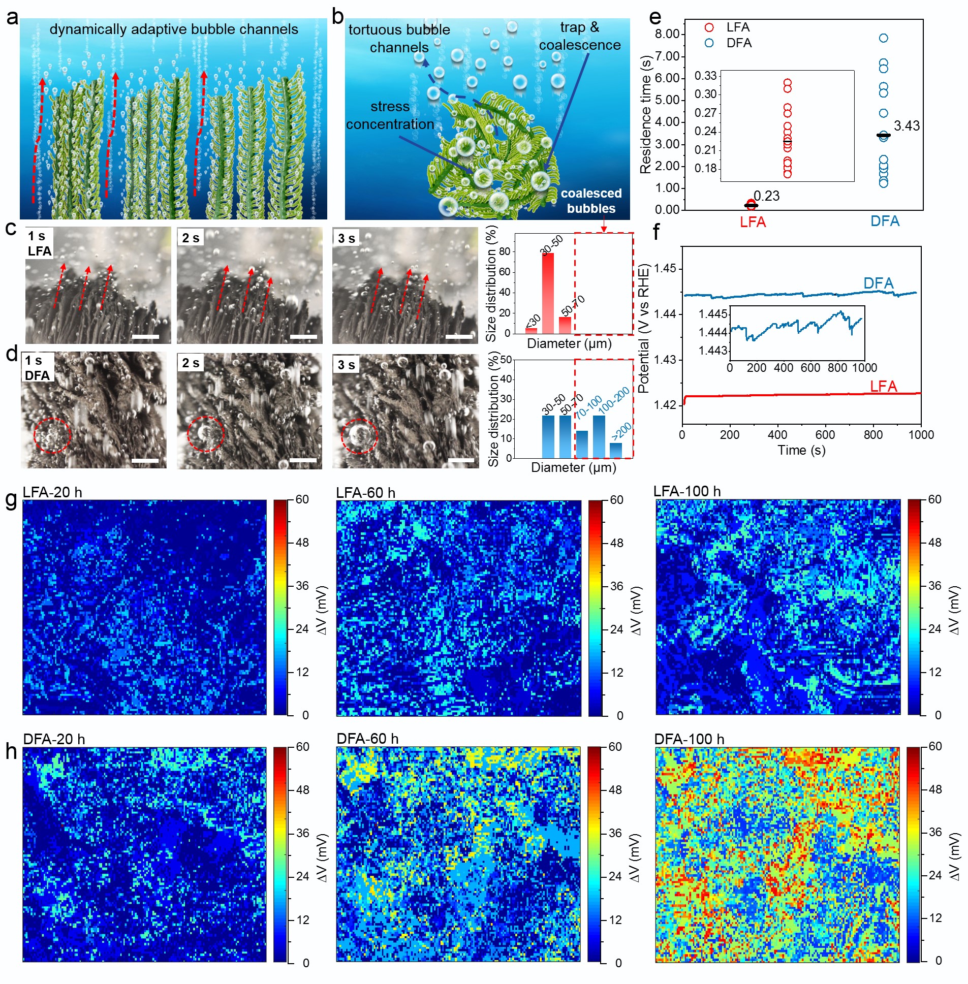 LFA和DFA(无序蕨类气凝胶)电极在排气性上有明显的偏差。LFA中的中间层为气泡输送提供了连续有序的微通道,在排出气泡时表现出动态自适应特性,因此气泡积聚和粘附最小。与LFA中有序的片层结构不同,DFA电极会发生气泡聚集和生长。因此, LFA电极捕获的气泡平均尺寸远小于DFA,而DFA电极捕获的大气泡更多。同时,气泡在LFA电极上的停留时明显短于DFA电极。