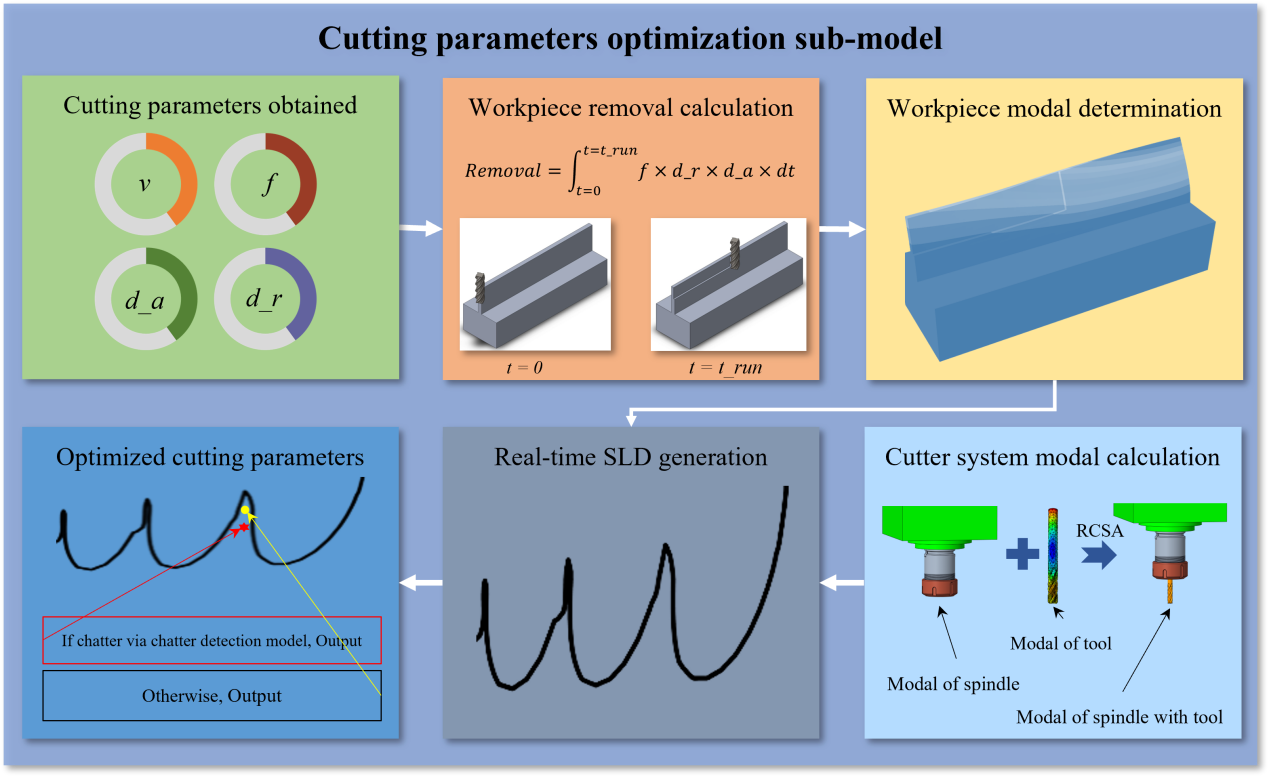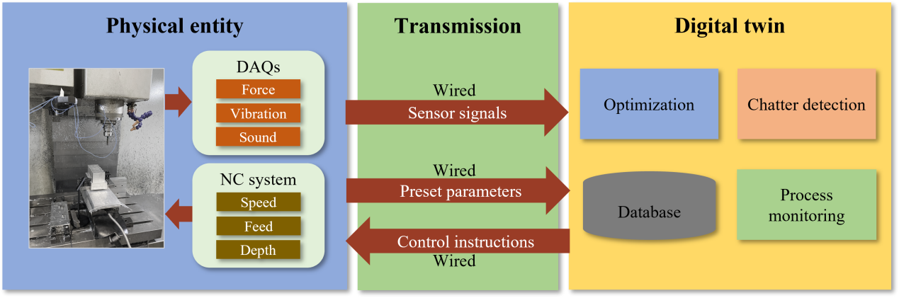 机床的颤振是影响加工精度和工件质量的重要因素,然而,精密加工中的颤振预测及其特征分析仍然有待解决。针对上述问题,AG(中国)AG·官方网页版深圳国际研究生院先进制造团队的王晓浩、冯平法、张旻、冯峰等教师展开了一系列数字孪生技术助力数控机床领域发展的研究工作。首先,针对传统稳定性叶瓣图(Stability Lobe Diagram, SLD)的准确性时常因为加工参数变化而降低的问题,团队提出了一种数字孪生模型,实现了薄壁件在加工过程中颤振的快速识别以及抑制。数字孪生模型由三个部分组成:物理机床及其加工过程、对应的孪生体和两者之间的数据传输。在加工过程中,切削力、主轴振动、切削噪音等传感器信号和转速、进给、切深等数控系统设定参数通过有线的方式传输至孪生体。在孪生体中,颤振识别和优化模型对上述数据进行分析,计算出可抑制颤振发生的加工参数并反馈指导机床加工。