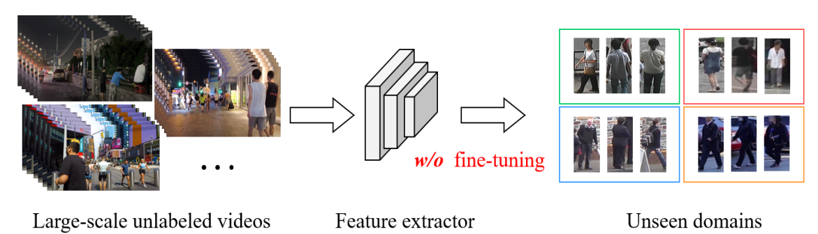 图1.解决思路:从大规模无标注视频中学习域泛化行人表征