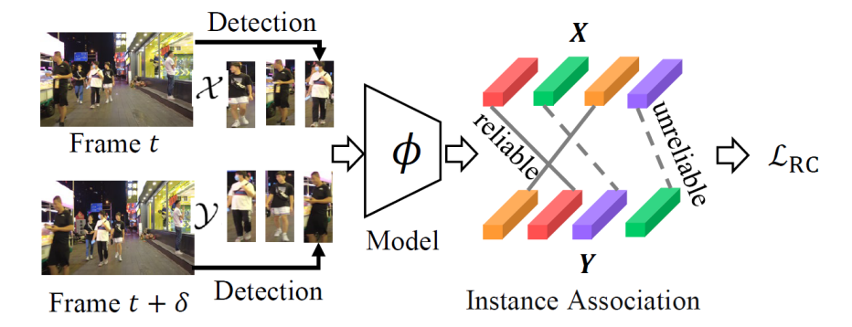 对于大规模的无标注数据,一个朴素的做法是采用经典的无监督对比学习方法,如MoCo、SimCLR、BYOL等训练模型。然而经过分析,作者发现这些无监督对比学习方法不适用于行人再识别任务。行人再识别任务要求属于同一个行人的多张图像具有相似的表征,而MoCo等方法为每一张图像学习唯一的表征,与行人再识别任务的要求不一致。为了能够驱动大规模的无标注数据来学习域泛化行人表征,作者提出了身份导向的自监督表征学习框架(Identity-Seeking Self-Supervised Representation Learning, ISR)。如图2所示,该框架包括两个主要部分:(1)基于最大二分图匹配构建跨帧正样本对。(2)基于所提出的可靠性引导的对比学习损失,抑制噪声正样本对的影响。ISR要求邻近帧中属于同一个行人的图像具有相似的表征,这与行人再识别任务的要求一致。ISR的训练复杂度和训练数据量呈线性关系,因此能够驱动大规模的训练数据。