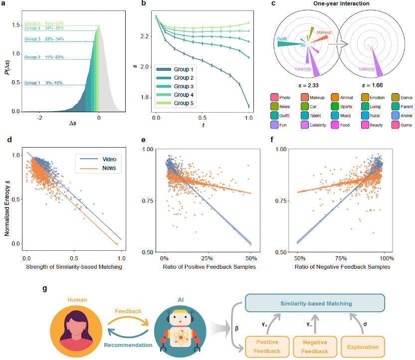 (a-c)聚焦于新闻与视频两个典型场景,量化真实世界信息茧房严重程度;(d-f)相似度匹配强度、正负反馈是影响信息茧房形成的重要因素;(g)基于实证发现与推荐算法领域实践,结合随机热力学理论,提出人-智自适应信息动力学模型