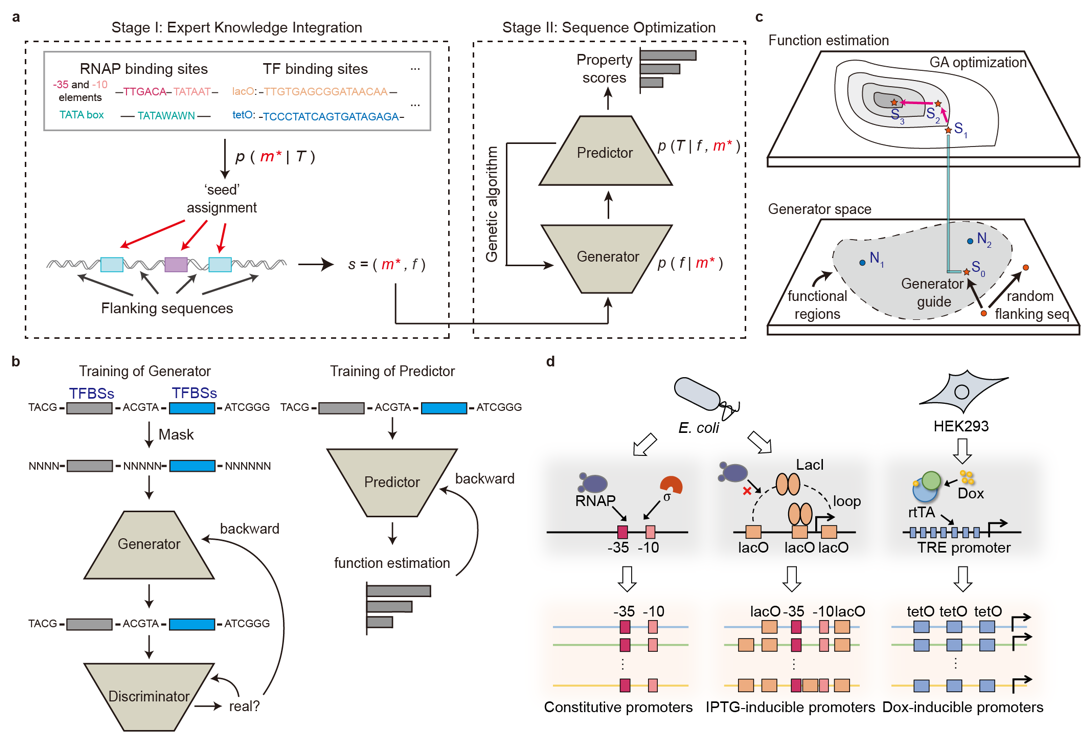 近年来,合成生物学作为一门新兴交叉学科获得了蓬勃发展,为破解人类面临的资源、健康、环境等重大挑战提供全新解决途径。合成生物学的核心理念是通过对DNA等生物大分子的逆向设计重构获得具有特定功能的人工生物系统。然而,这些生物分子编码的组合排列空间十分庞大,序列与功能的映射关系复杂,对生物大分子序列进行精准设计极具挑战。近期人工智能技术的突破引发了自然语言处理、计算机视觉等领域的革命性进步,尤其是以ChatGPT等为代表的生成式智能模型的突破,彰显出AI在提取复杂模式、生成复杂对象上的强大潜力。基于人工智能技术逆向设计启动子等具有特定功能的生物大分子序列,将为合成生物学的发展提供强大的设计工具和丰富的基础元件。