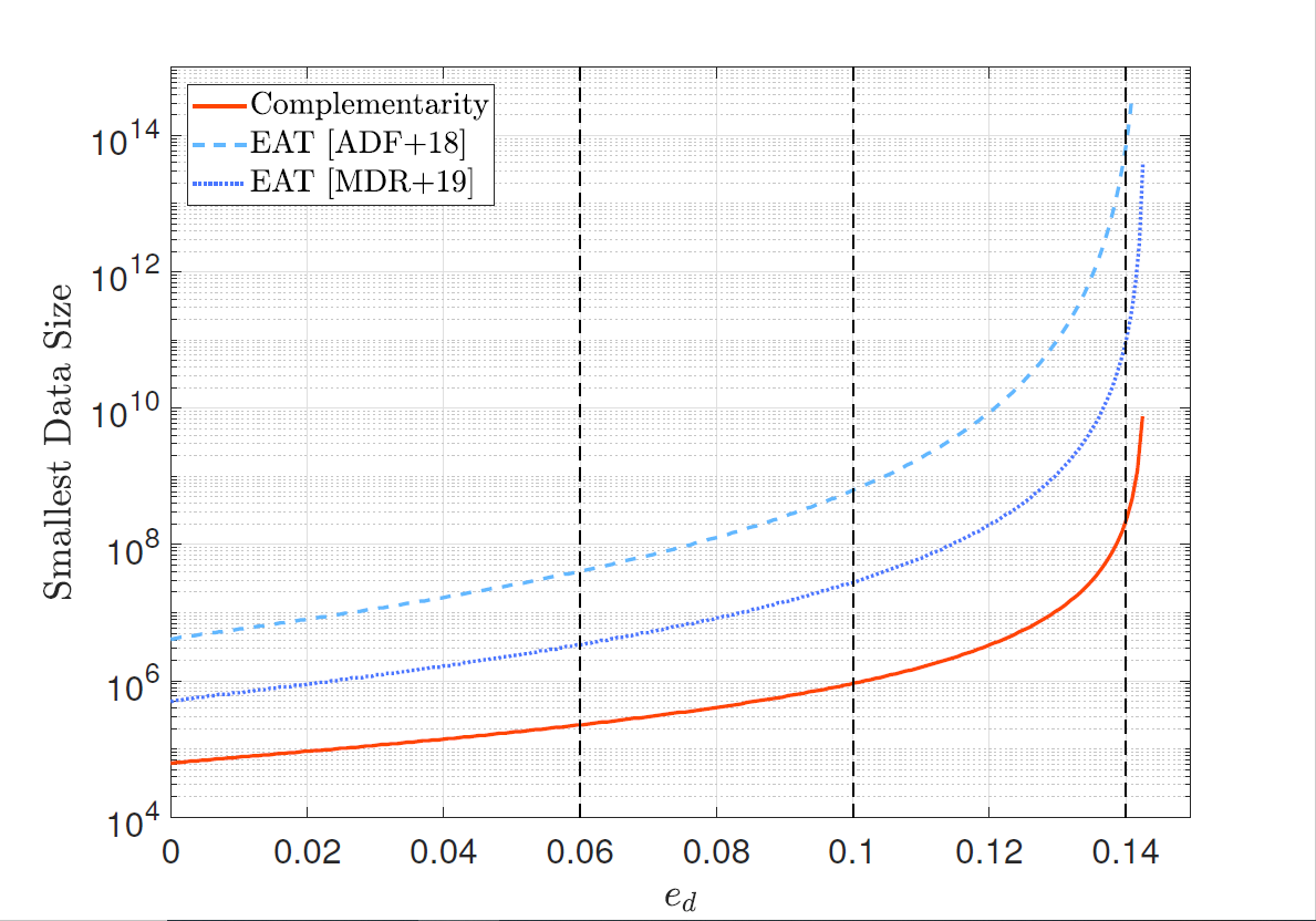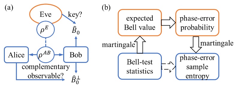 在新的研究工作中,马雄峰研究组解决了设备无关量子密码协议中,安全性的测量互补性来源这一开放性问题。该研究以设备无关量子密钥分发协议为例,定义了关于密钥生成观测量的互补测量,从而通过一个等价的量子纠错过程,通过相位错误数量反映实际协议中的隐私泄露,给出了紧致的解析估计(图2)。此外,通过推广经典信息论中的采样熵概念,并结合随机过程中的鞅论等技术,该研究设计了适用于非独立同分布统计的新型参数估计方法,从而给出了适用于最一般的相干攻击情形的完整安全性分析。
