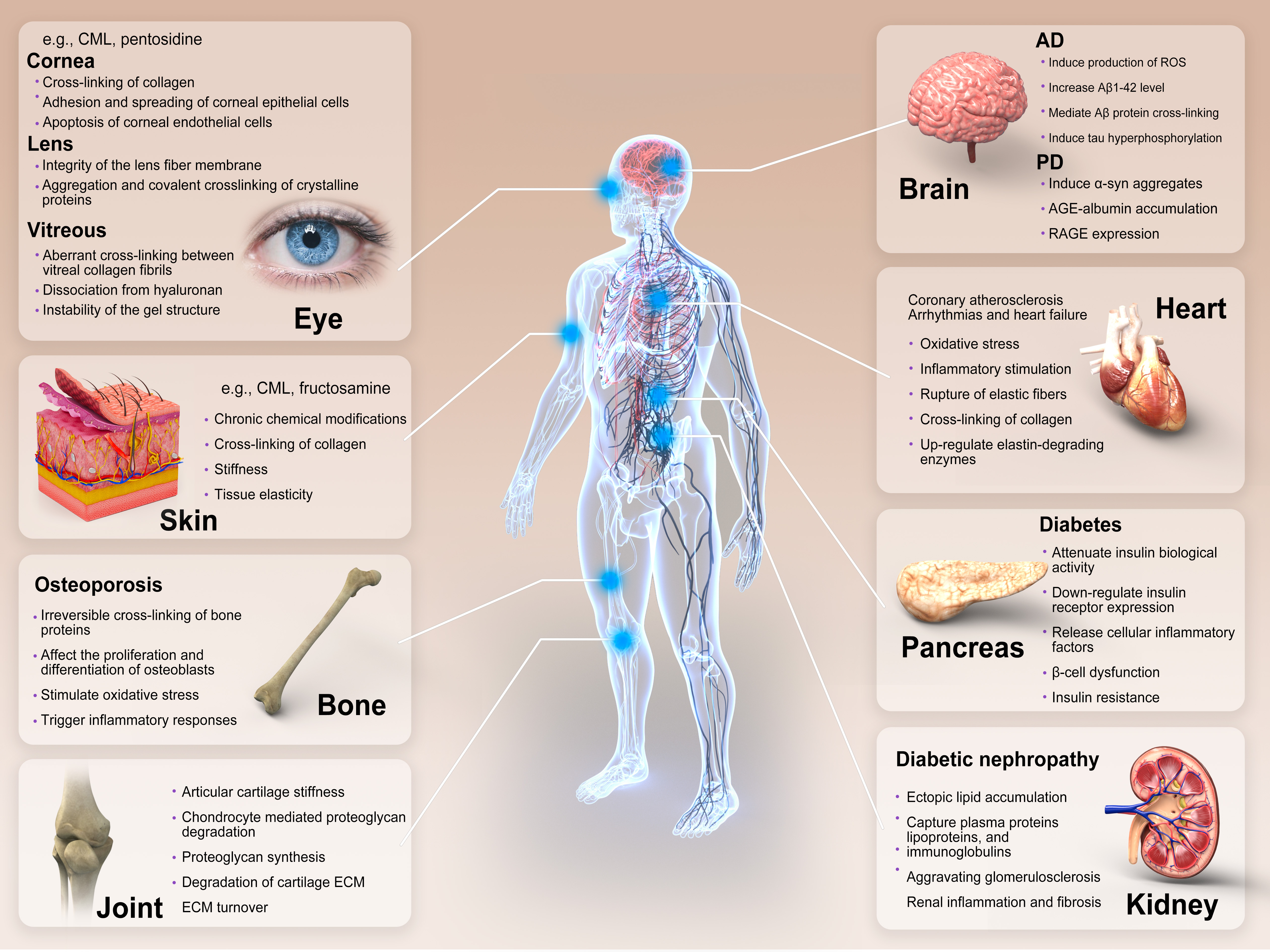 综述主要关注AGEs与自身免疫和炎症性疾病、神经退行性疾病、糖尿病和糖尿病肾病、心血管疾病和骨退行性疾病的关联性。一方面,这些疾病都与炎症信号有着密切的关系,而AGE受体(Receptor of AGE,RAGE)在慢性炎症和免疫功能障碍中起着不可忽视的作用。另一方面,Aβ、tau蛋白、α-突触核蛋白、朊病毒等蛋白积累,可以被AGEs修饰而糖基化,促进异常聚集,引发病理性损伤的增强和细胞凋亡。AGEs与胶原蛋白、弹性蛋白和其他大分子上的氨基发生反应,弹性纤维的断裂和胶原纤维的交联导致大分子结构刚性增加和血管壁逐渐硬化。AGEs对骨生物力学性能的有害影响部分是由于细胞外环境中长期存在的基质蛋白(如胶原I,约占骨总胶原含量的95%),长期暴露于AGEs的骨蛋白不可逆交联导致其抵抗降解,结构和功能发生变化,影响成骨细胞的增殖和分化。