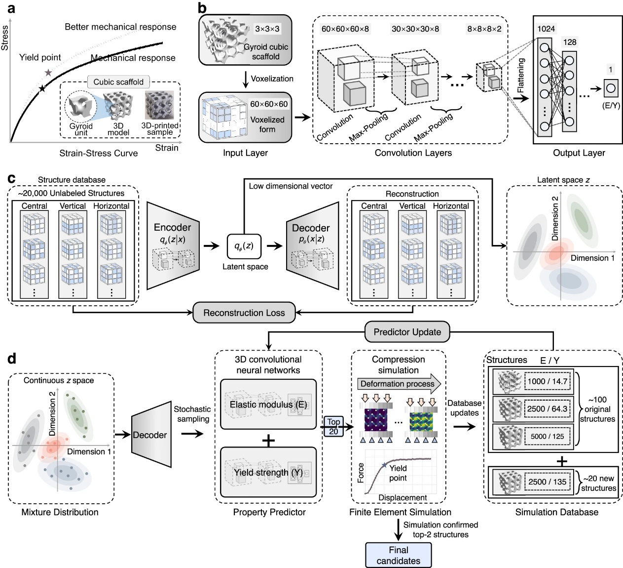 多孔结构超材料广泛存在于自然界中,如蝴蝶翅膀和人体骨骼,展现出优于基质材料的力学和生物学性能,被广泛应用于轻质结构、组织工程、声学和电学等领域。3D打印使得高精度复杂多孔结构的低成本高效制造成为了可能,然而,超材料的结构设计空间十分庞大,结构与性能的映射关系复杂,如何发挥3D打印的结构功能化优势成为科学难题。基于机器学习的设计方法能够实现无先验知识条件下的高效设计,但目前发表的工作多集中于二维结构,仅适用于低维或单目标优化问题。工程中广泛应用的三维结构通常涉及高维多目标优化,具有数据稀疏性、庞大搜索空间和严格外部约束等特点。例如,用于骨缺损填充修复的多孔骨植入物需要具有和骨组织匹配的变形响应和足够的压缩强度,同时具有良好的生物活性和促成骨特性;而对于一个具有3*3*3个结构单元的多孔结构,如果每个单元的孔隙率有7个变量,那么理论上就有727种设计可能,因此需要一种高效的优化设计方法实现多目标性能优化和精准治疗目的。