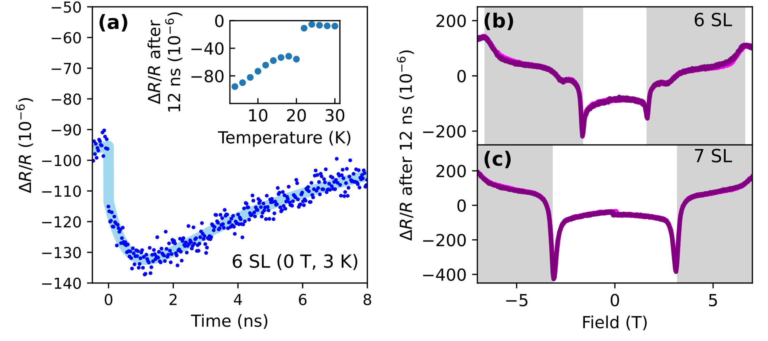 图2. 薄层MnBi2Te4的磁状态也被时间分辨瞬态反射光谱测量。(a)没有外磁场的情况下6层区域3K温度下的时间分辨反射率,显示了与克尔测量中相似的特征(图1b)。此信号在奈尔温度以上消失(插图)。(b, c)6层和7层样品在12ns处的瞬态反射率信号随外加磁场的关系,在转变点附近显示出明显的尖峰(与图1一样,cAFM区域由灰色阴影表示),表明信号与磁状态相关。与关于磁场反对称的克尔信号相比(图1e, f),反射率信号几乎关于场对称