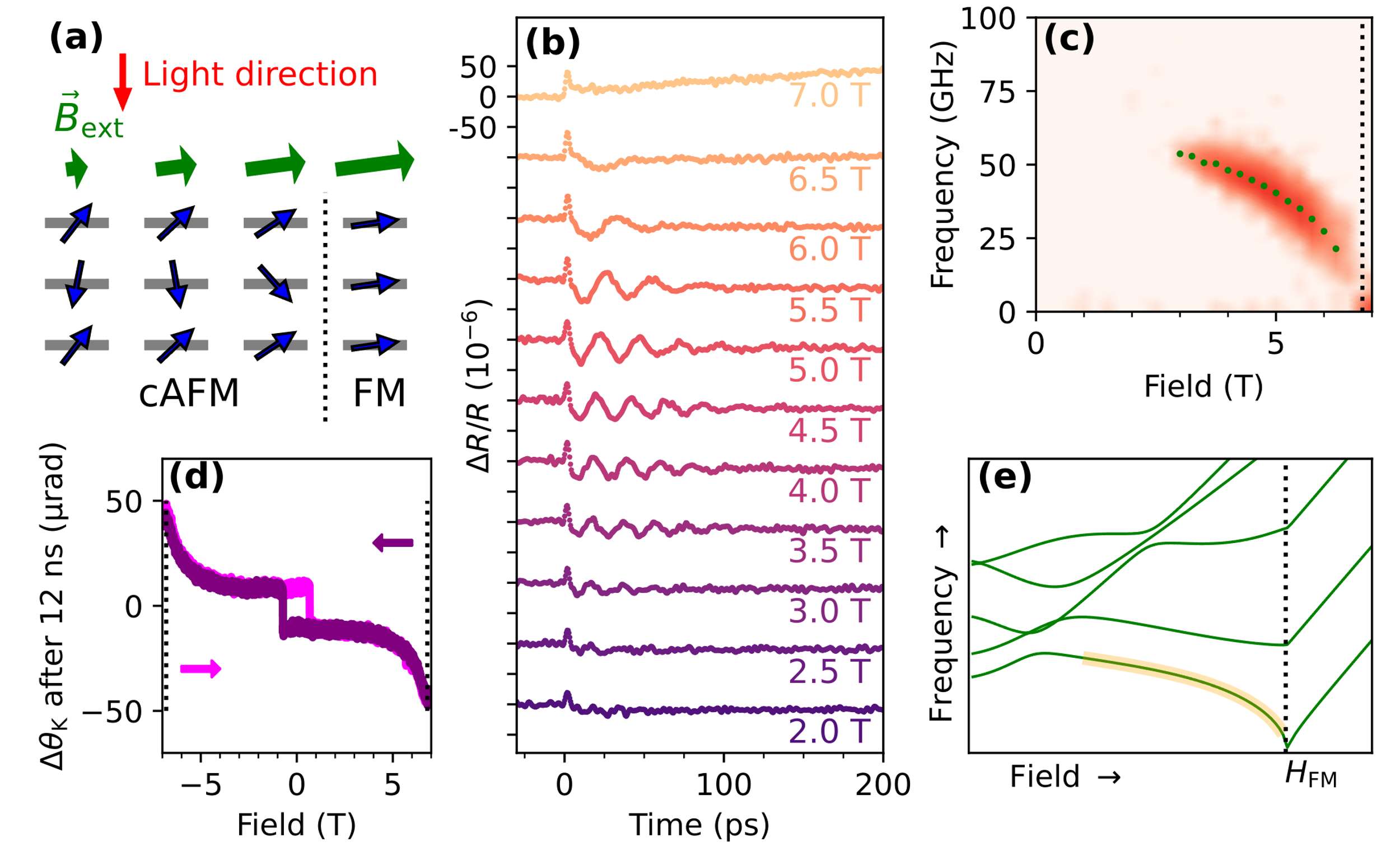 图3. MnBi2Te4中的磁振子振荡。(a)Viogt构型的实验示意图,外磁场接近于样品面内。在非零场强下,自旋开始倾斜(cAFM态),最终在高场下转变为FM序。(b)5层样品在3K温度不同磁场下瞬态反射率信号,可以观察到磁振子振荡。(c)FFT得到的磁振子随外磁场的依赖。在~6.8 T(cAFM-FM转变处)降至0频率。(d)在12纳秒处的瞬态克尔信号随外场的关系,类似法拉第构型可以揭示磁状态(图1e,f)。6.8 T的尖峰对应cAFM-FM转变(与磁振子消失的磁场相同)。(e)理论计算得到的层间磁子能量与磁场关系,实验观察到的为最低能支磁子