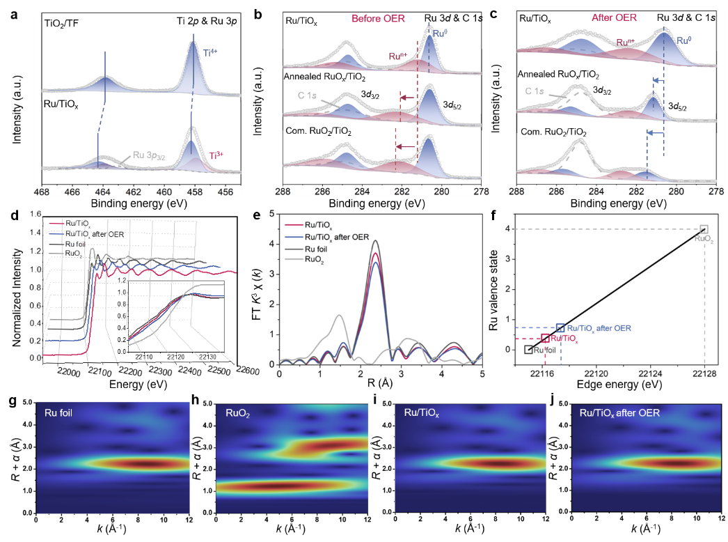 结合实验表征(图3)和理论计算(图4)证明了原位生成的非化学计量氧化物TiOx对稳定Ru活性中心的关键作用。TiOx中的原子级氧空位缺陷一方面诱导Ru位点的电荷重新分布,防止Ru活性中心的过度氧化溶出;另一方面通过增强金属-载体相互作用从结构上限域Ru纳米颗粒,防止其团聚失活,从而突破了高活性和长寿命水氧化催化难以兼得的瓶颈,对于“绿氢”的高效制备具有重要意义。