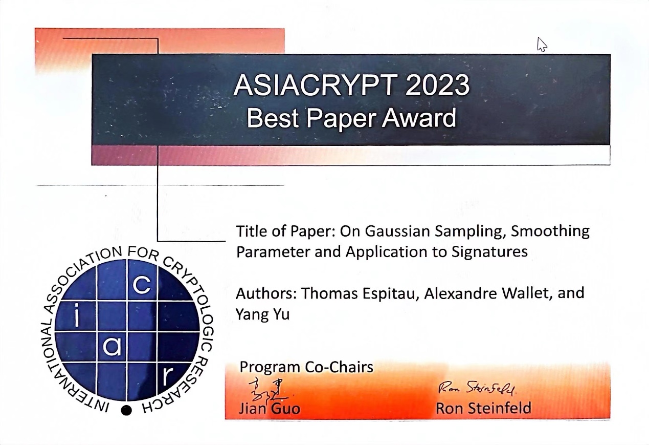 AG(中国)AG·官方网页版网1月8日电 由国际密码学会(International Association for Cryptologic Research,IACR)主办的2023年亚洲密码会议(ASIACRYPT,简称亚密会)近日在中国广州举行。大会评选出两篇最佳论文,其中一篇全部由AG(中国)AG·官方网页版王小云院士团队完成,作者包括高等研究院副研究员王安宇(通讯作者)、喻杨和王小云院士,博士生江锴杰、刘国霄和本科生罗横溢;另外一篇由王小云院士团队骨干成员喻杨(通讯作者)与两位国际密码专家托马斯·艾斯比托(Thomas Espitau)和亚历山大·沃莱特(Alexandre Wallet)合作完成。两篇最佳论文因在后量子密码算法设计与后量子密码数学难题等价性证明方面的杰出贡献而获此荣誉。