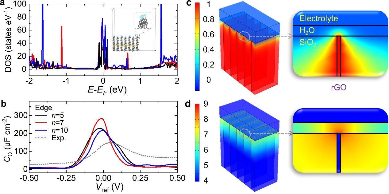 图3.基于石墨烯边缘模型的理论计算。(a)具有不同层数的石墨烯边缘结构的电子态密度计算结果以及(b)电容-电压曲线的实验和理论计算结果比较;(c)使用COMSOL多物理场模拟石墨烯边缘的局部电压分布和(d)局部电场分布