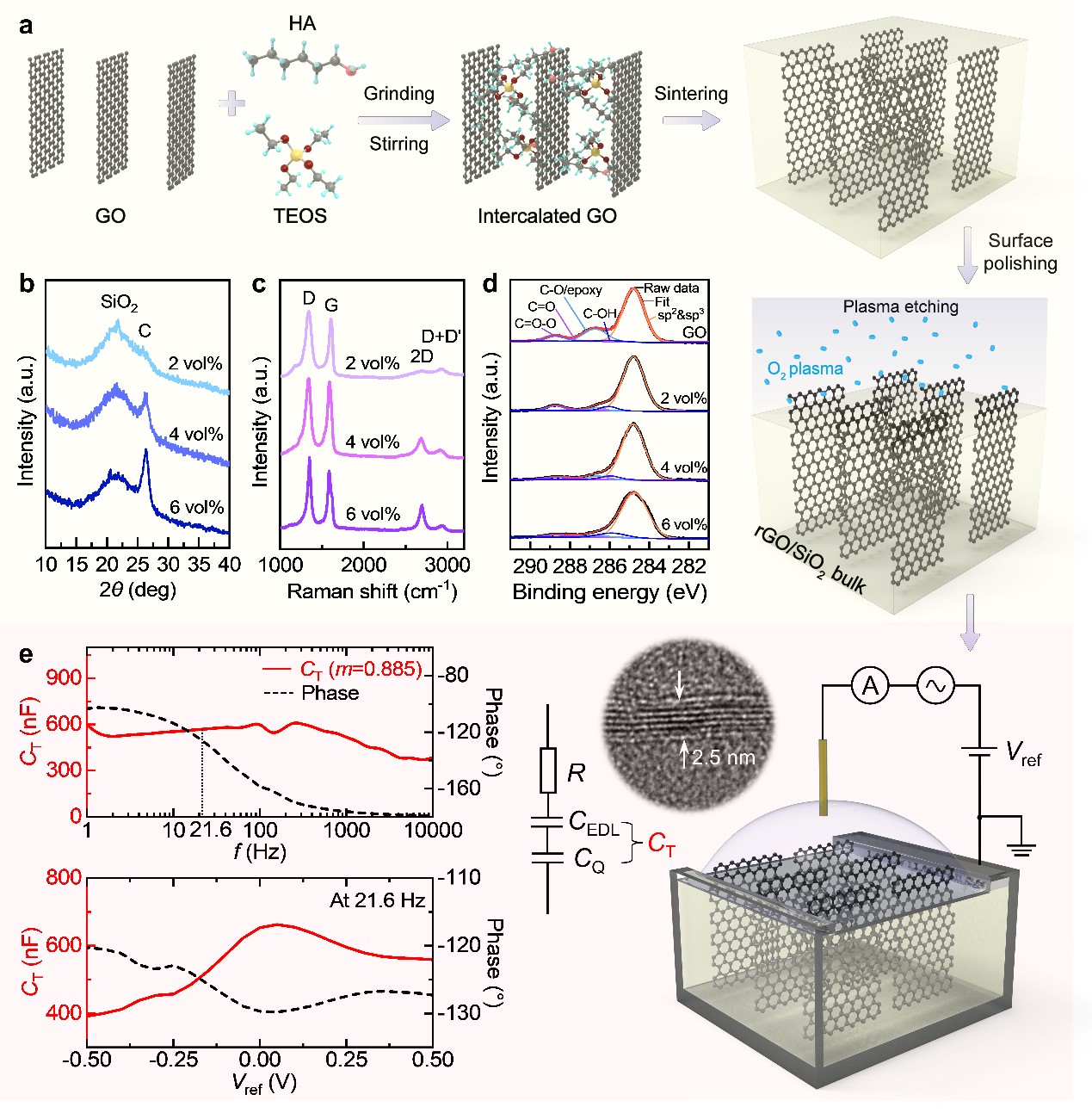 图2.传感器件的制备及表征。(a)rGO/SiO2复合材料的制备过程示意图;(b-d)复合材料的XRD图谱、拉曼光谱和XPS结果;(e)富石墨烯边缘传感器的等效电路示意图和测量结果