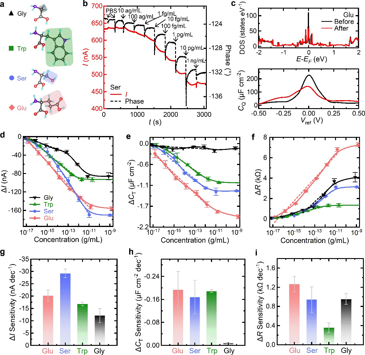 图4.石墨烯边缘传感器对氨基酸的传感性能。(a)氨基酸结构示意图;(b)丝氨酸浓度变化下的电流-时间相应曲线;(c) 谷氨酸吸附前后石墨烯边缘电子态密度和电容-电压曲线的理论计算结果;(d-f)器件随不同种类氨基酸浓度变化的电流、电容和电阻响应;(g-i)器件对不同种类氨基酸的检测灵敏度和选择性