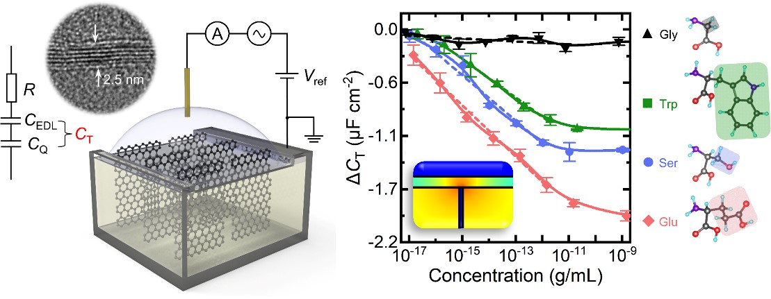 进一步测试发现,当氨基酸吸附于石墨烯边缘时,石墨烯边缘传感器对具有不同官能团的氨基酸具有不同的响应,其检测限低至~10 ag/mL,优于以往报道的基于石墨烯基面的高性能生化传感器(检测限~fg/mL)。同时,与基于剧烈氧化还原反应的电化学生化传感器不同,基于量子电容的场效应传感机制,能够无损检测生物化学分子的吸附,避免电化学损伤以确保传感性能的可靠性和再现性。