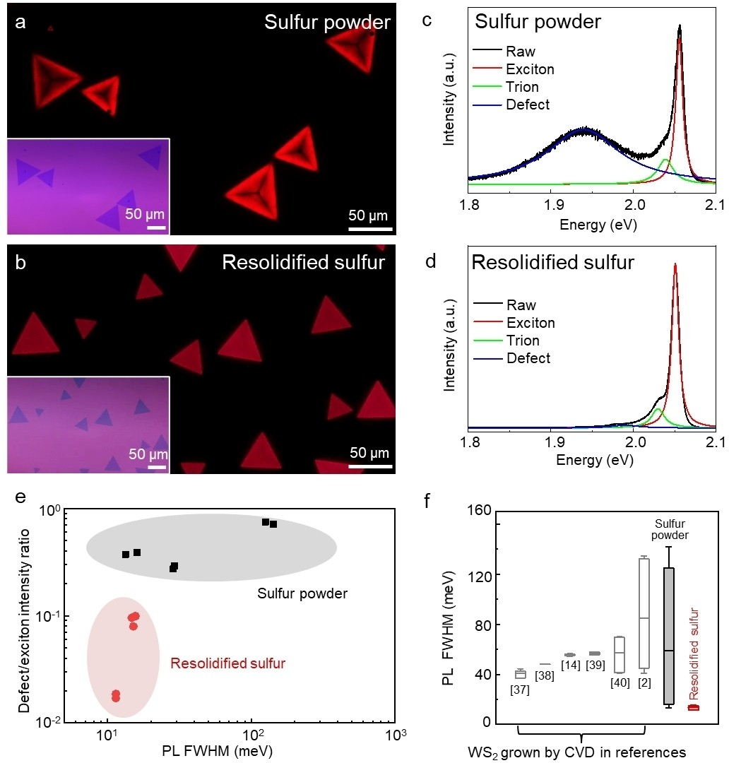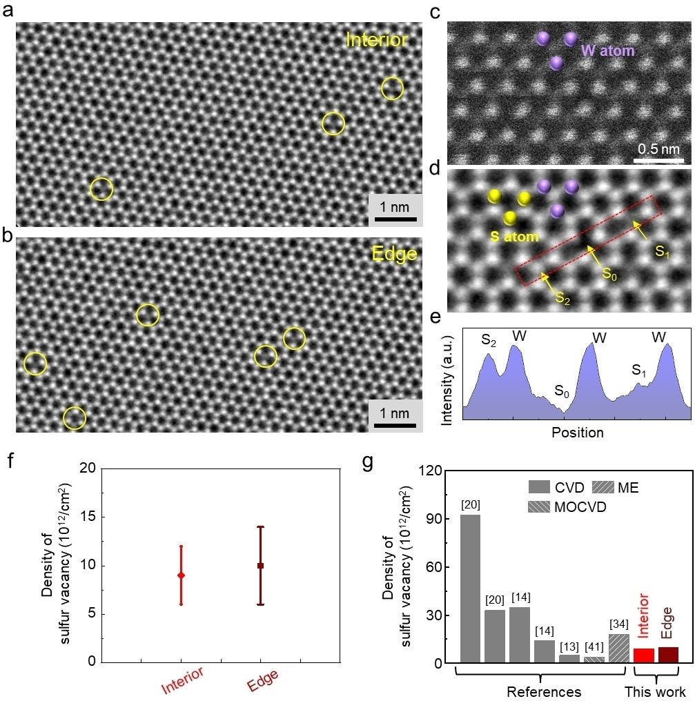 研究人员比较了使用不同硫前驱体的生长效果。与传统方法相比,采用重凝硫前驱体生长的单层WS2表现出均匀的荧光强度。低温下测得该类样品具有极窄的光致发光峰(13.6 ± 1.9 meV),缺陷峰强度明显低于传统样品,本征发光更强。研究人员采用球差校正扫描透射电子显微镜在原子尺度统计了WS2的缺陷密度,结果表明采用重凝硫前驱体生长的单层WS2具有高结晶质量和高均匀性(边缘区域和中间区域缺陷密度相近,约为1×1013cm2),进一步证明了重凝硫前驱体的有效性。