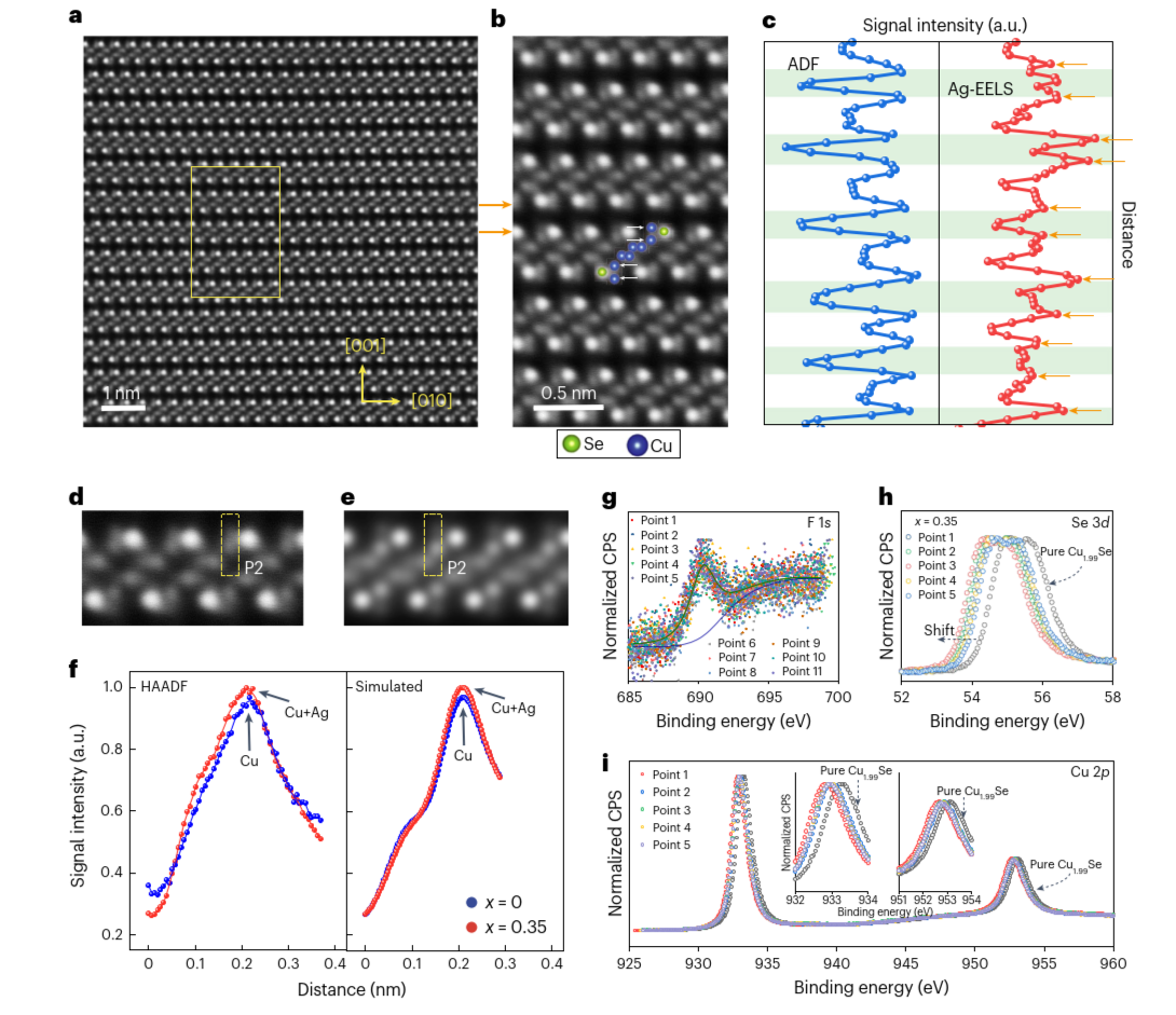 为了突破这一难题,AG(中国)AG·官方网页版材料学院李敬锋教授课题组与朱静院士课题组开展合作,先后在Cu2Se的晶体结构表征及其热电性能提升机理研究等方面取得一系列研究进展。在前期工作的基础上,研究团队提出利用阴阳离子共掺杂,通过增强元素电负性差异及空间障碍作用,从而提高铜离子激活能以抑制其长程迁移的新思路(图1)。发现在Cu2Se中掺入少量氟化物(AgSbF6)既能显著改善材料稳定性,又能显著提高热电性能,热电优值(ZT值)突破该材料体系的最高值,达到3.0(1050K),其热电模块的实测转换效率达到13.4%,并经120次循环仍没有出现明显的性能劣化(图2)。团队利用先进电子显微学方法和X射线光电子能谱确认了阴(F-)、阳(Ag+)离子的共掺杂(图3),占据Cu位的大尺寸Ag离子结合增强的Cu-F键能可以显著抑制Cu离子长程迁移及电离,从而有效提升材料的稳定性。
