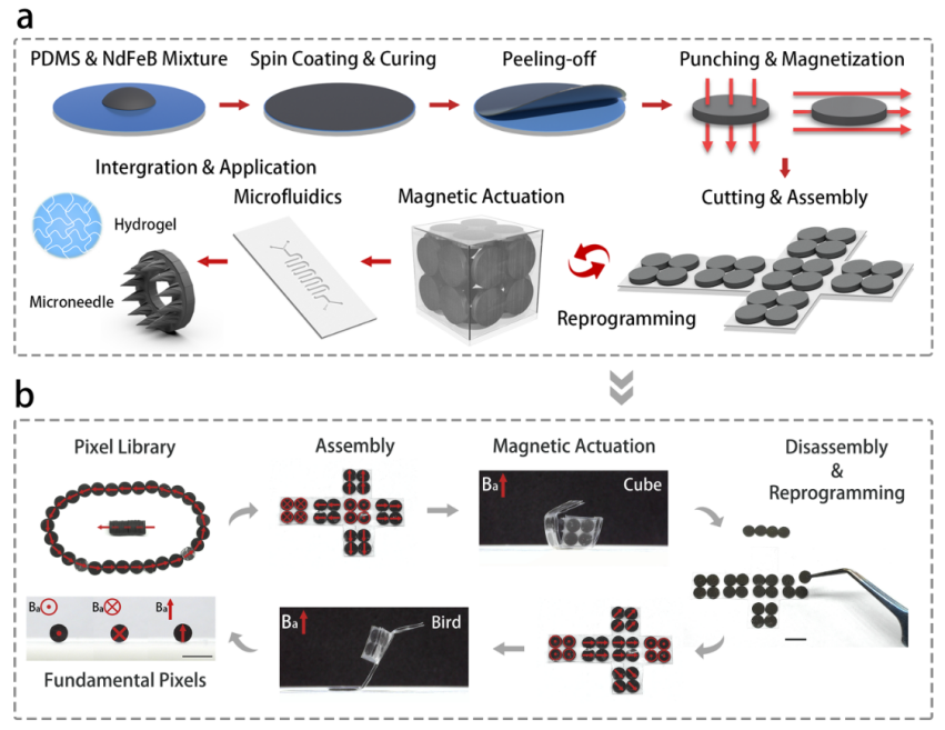 相关研究成果以“基于像素化组装的可重编程可集成微流控功能模块的磁控柔性驱动器”(Reprogrammable Magnetic Soft Actuators with Microfluidic Functional Modules via Pixel-Assembly)为题,近日发表于《微尺度》(Small)。