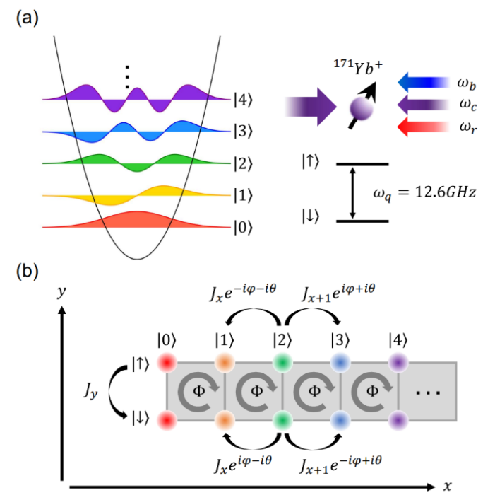 合成维度是量子模拟研究拓扑物态的重要手段,可用于研究实验室难以直接获得的高维材料性质,也可通过调节格点之间的跃迁振幅实现可控的人工磁场,模拟实验中难以直接达到的磁场强度。此前,在中性原子、光子学等系统中已通过内部能级和离散的频率、动量、角动量等模式实现过合成维度。该研究首次在离子阱系统利用离子在空间振动的无穷维福克态(Fock state)实现合成维度,扩展了合成维度的实现方式和在离子阱系统的应用。