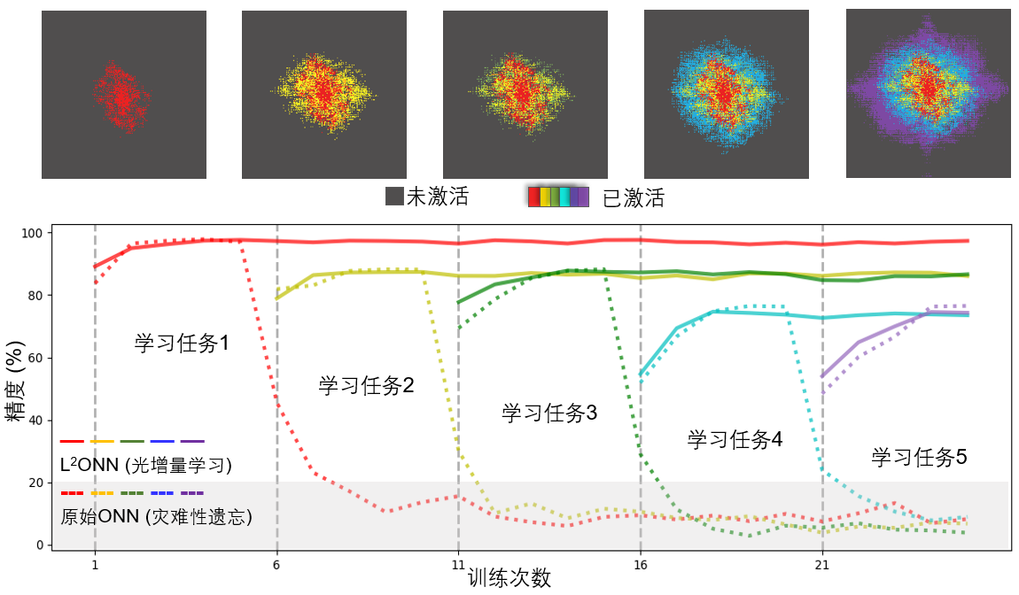 图3.光终身学习芯片原型系统、增量学习过程以及设计原理