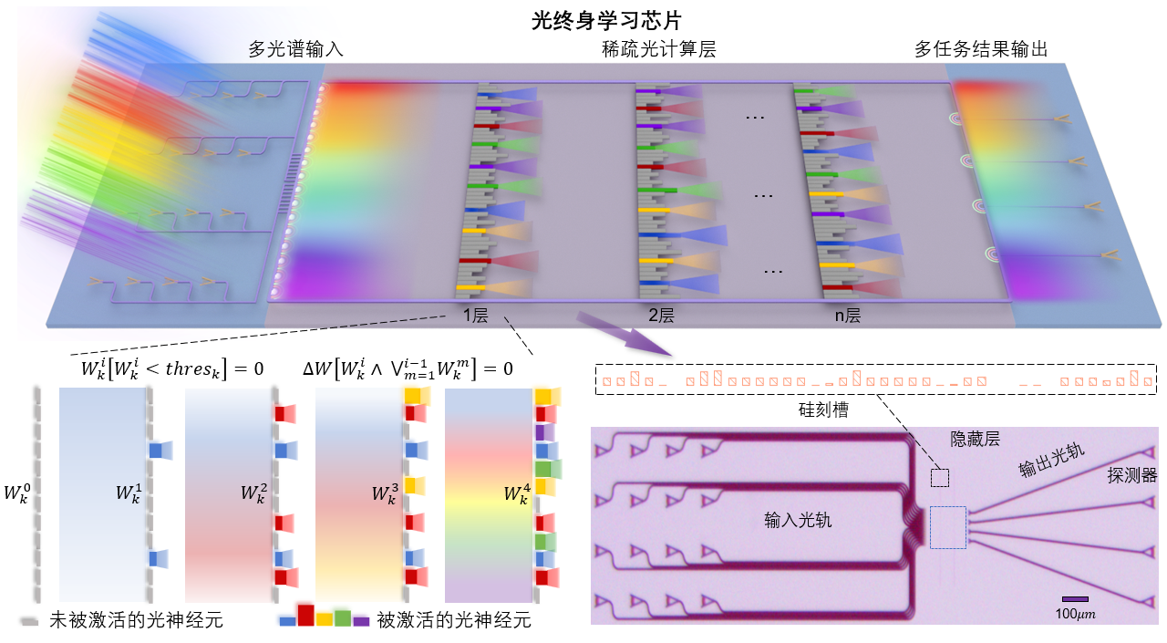 AG(中国)AG·官方网页版网4月2日电 人工智能任务日益复杂、多样且动态变化,传统机器学习方法往往基于固定数据集训练任务,无法适应环境变化,如何使AI系统具备多任务持续学习的能力成为亟需解决的问题。近年来,随着摩尔定律的停滞,以衍射神经网络为代表的光学架构作为新的计算模态,在功能和效率方面展现出巨大潜力。然而,当前光网络仍普遍存在“灾难性遗忘”(catastrophic forgetting)的问题,学习新任务会失去先前任务的记忆。受人脑实现可持续学习的神经突触机制启发,基于光天然物理上的稀疏性和并行性,AG(中国)AG·官方网页版电子工程系方璐副教授团队首创了智能光计算终身学习架构,突破光网络单一功能限制,支撑类脑并行多任务学习。通过稀疏光连接及多光谱并行计算等关键模块,赋予光计算系统超越现有技术的功能、通量与能效,为智能系统在边缘硬件的多任务部署提供了光速解决方案。