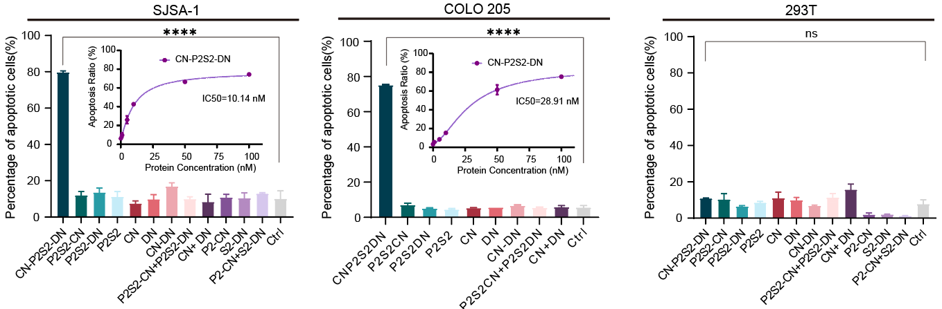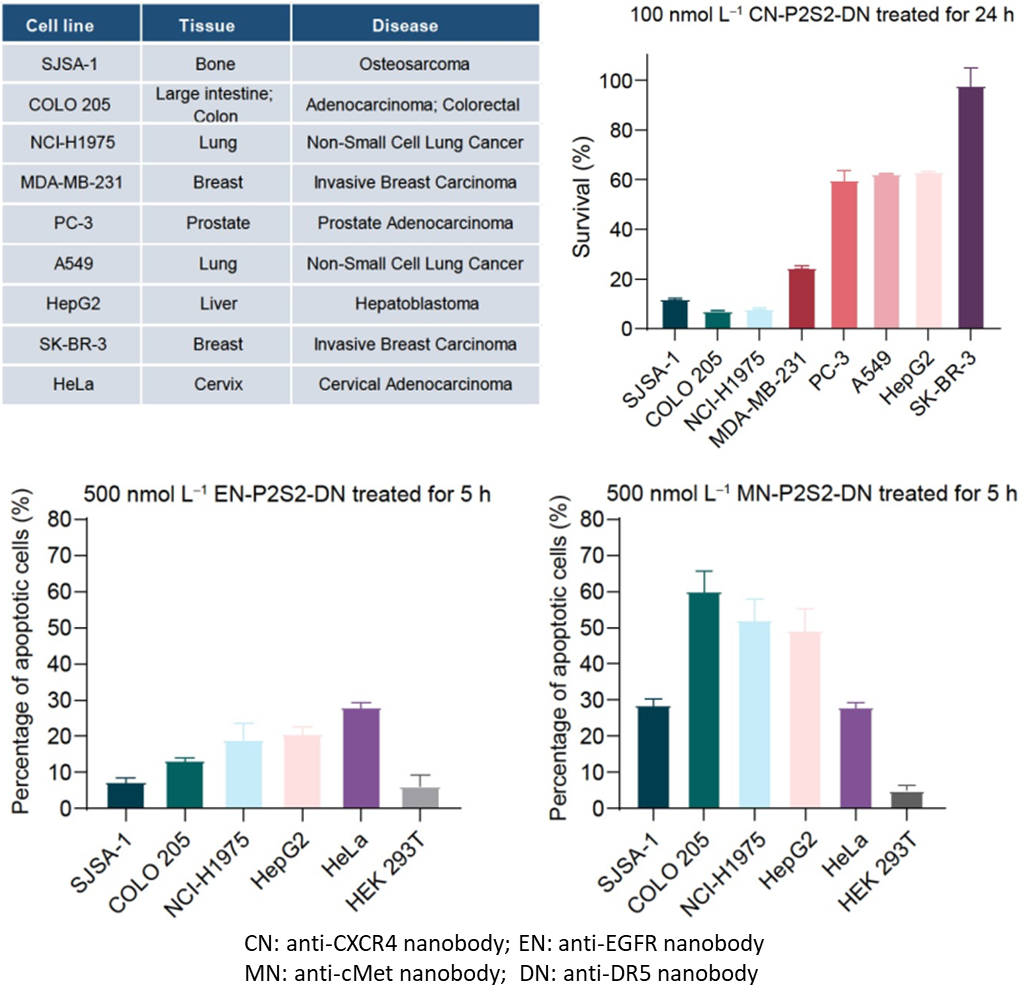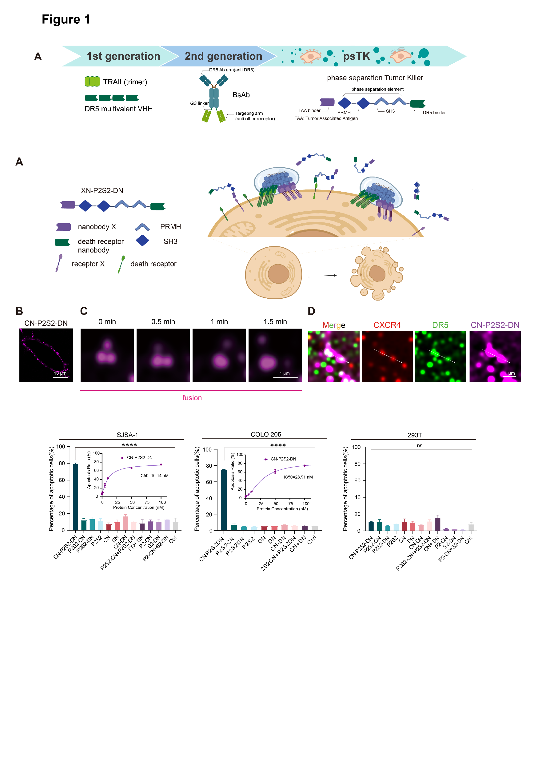 这类名为“相分离肿瘤杀手(phase-separatedTumorKiller,psTK)”的触发器,尽管设计简约,却能够诱导死亡受体与肿瘤相关受体的共聚集,从而实现相分离介导的条件性凋亡激活(图1)。值得注意的是,传统设计常采用如SUMO3和SIM(SUMO3-interacting motif)这对相互作用基序,通过调整其串联表达的数量来重构多价依赖的相分离现象,但这对后续的产业化应用和转化提出了更高的要求和挑战。为了进一步优化融合蛋白的表达形式,该研究巧妙地设计了基于低价态串联重复的相分离元件,即均为二价PRM和SH3的组合(简称P2S2)。将分别靶向结合肿瘤细胞表面高表达的CXCR4(C-X-C chemokine receptor type 4)和死亡受体DR5(Death receptor 5)的纳米抗体CNB和DNB与P2S2融合表达,得到了融合蛋白CN-P2S2-DN。相比早期设计,CN-P2S2-DN同样能够介导相分离依赖的肿瘤细胞凋亡,且以单一蛋白形式的制备更为高效、便捷。此外,这种设计在肿瘤特异性靶点(包括EGFR、MET等)及疾病适应症的拓展方面也显示出了显著的特异性肿瘤细胞杀伤效果。
