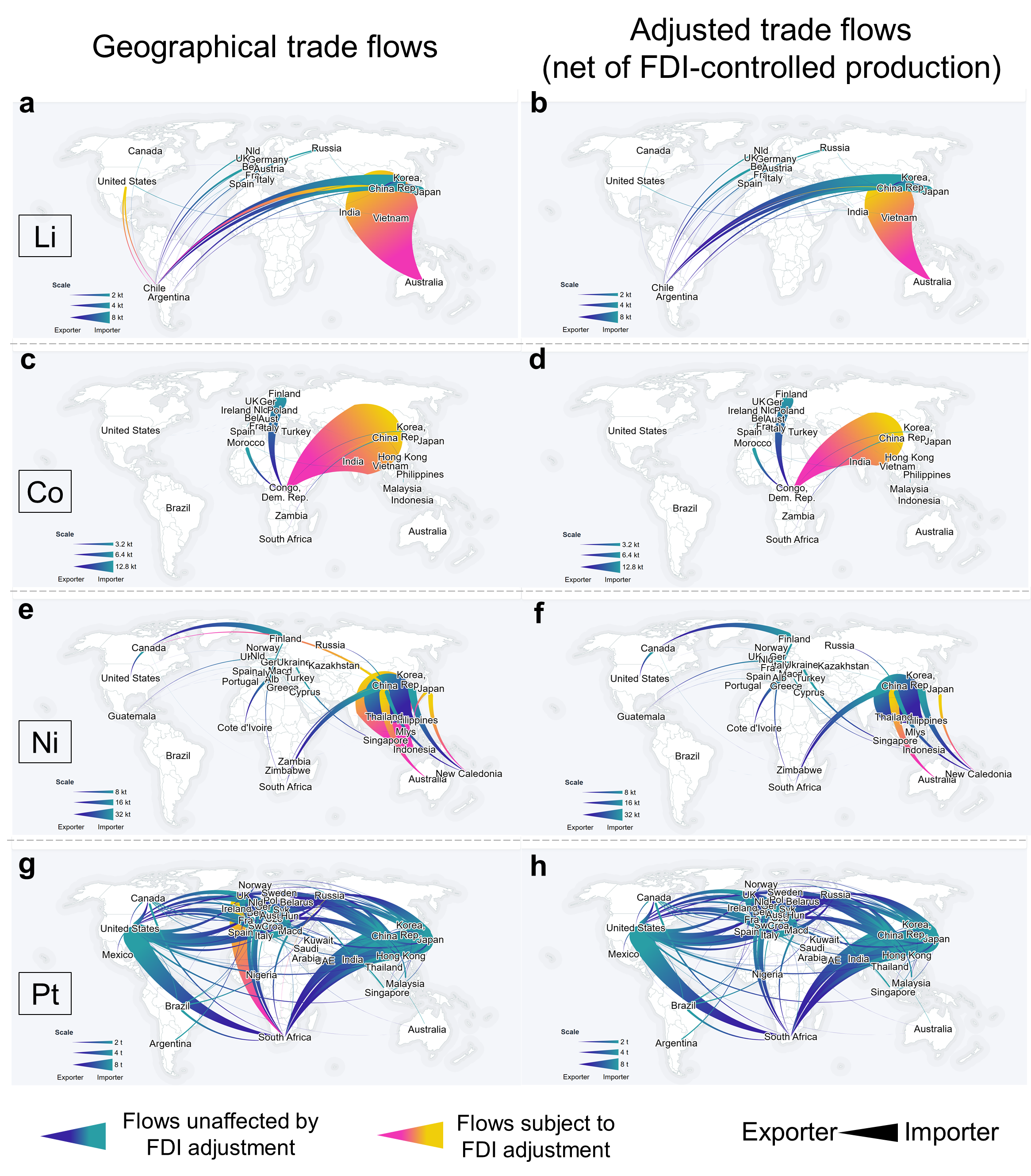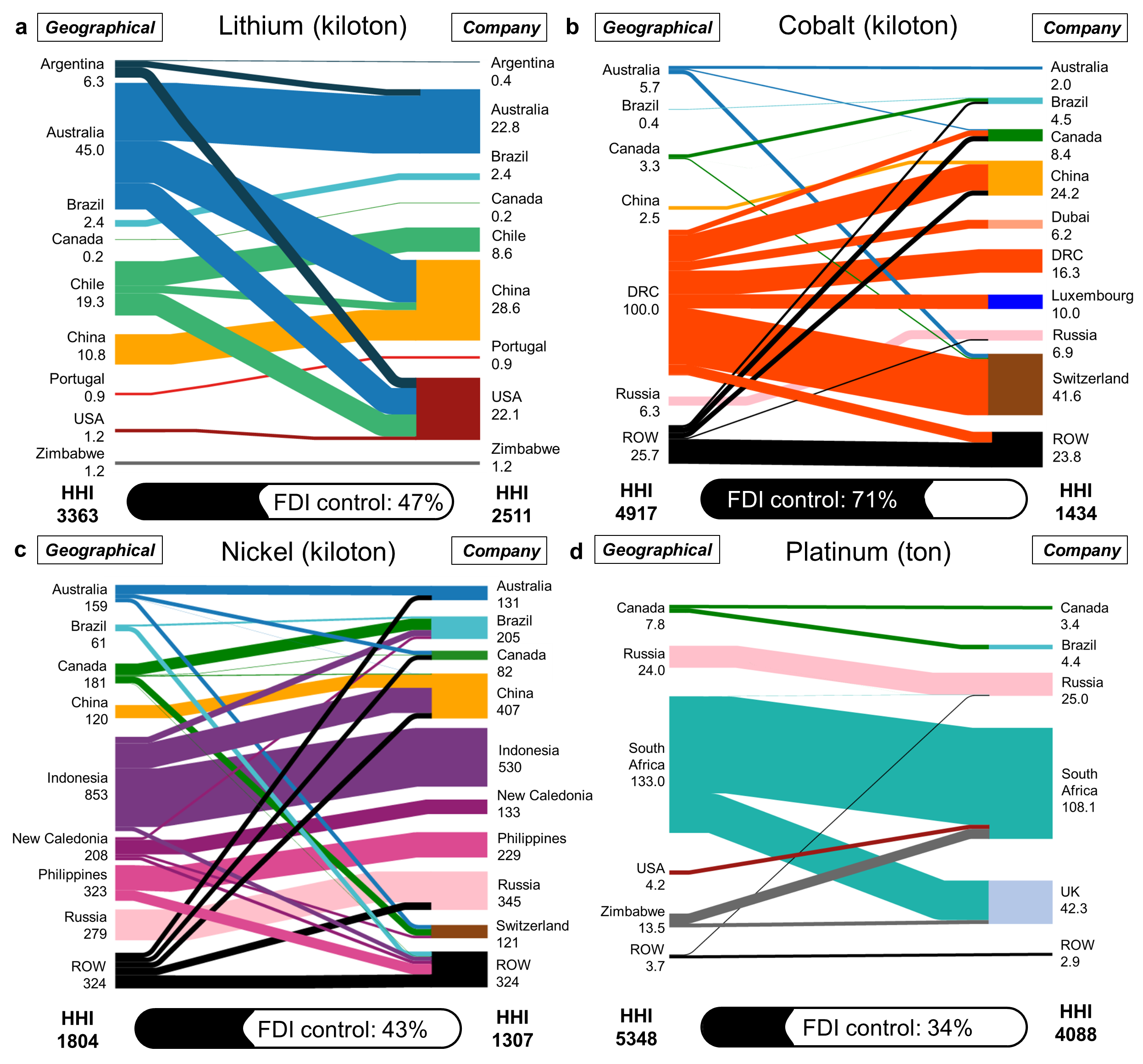 研究团队发现,在2019年全球有47%的锂、71%的钴、41%的镍和34%的铂的生产受外国直接投资控制。由于广泛的外国直接投资存在,四种材料的全球生产和贸易网络的地理和公司视角之间存在明显的所有权差异。在所有外国直接投资中投资者都遵循“母国优先”模式的假设情景下,外国直接投资在缓解美国的锂供应、英国的铂供应、日本的镍供应、中国的锂和钴供应的风险方面具有巨大潜力。在只有国家主导的投资者才会优先考虑本国利益的情景下,外国直接投资对供应风险的缓解作用主要体现在由中国国有企业主导的钴和镍行业。两种视角下的SRI量化结果的比较差异体现了外国直接投资在降低供应风险方面的潜在作用,而现实情况则介于研究团队所建立的两种情景结果之间。研究结果揭示了在关键材料供应安全评估中考虑外国直接投资的重要性。