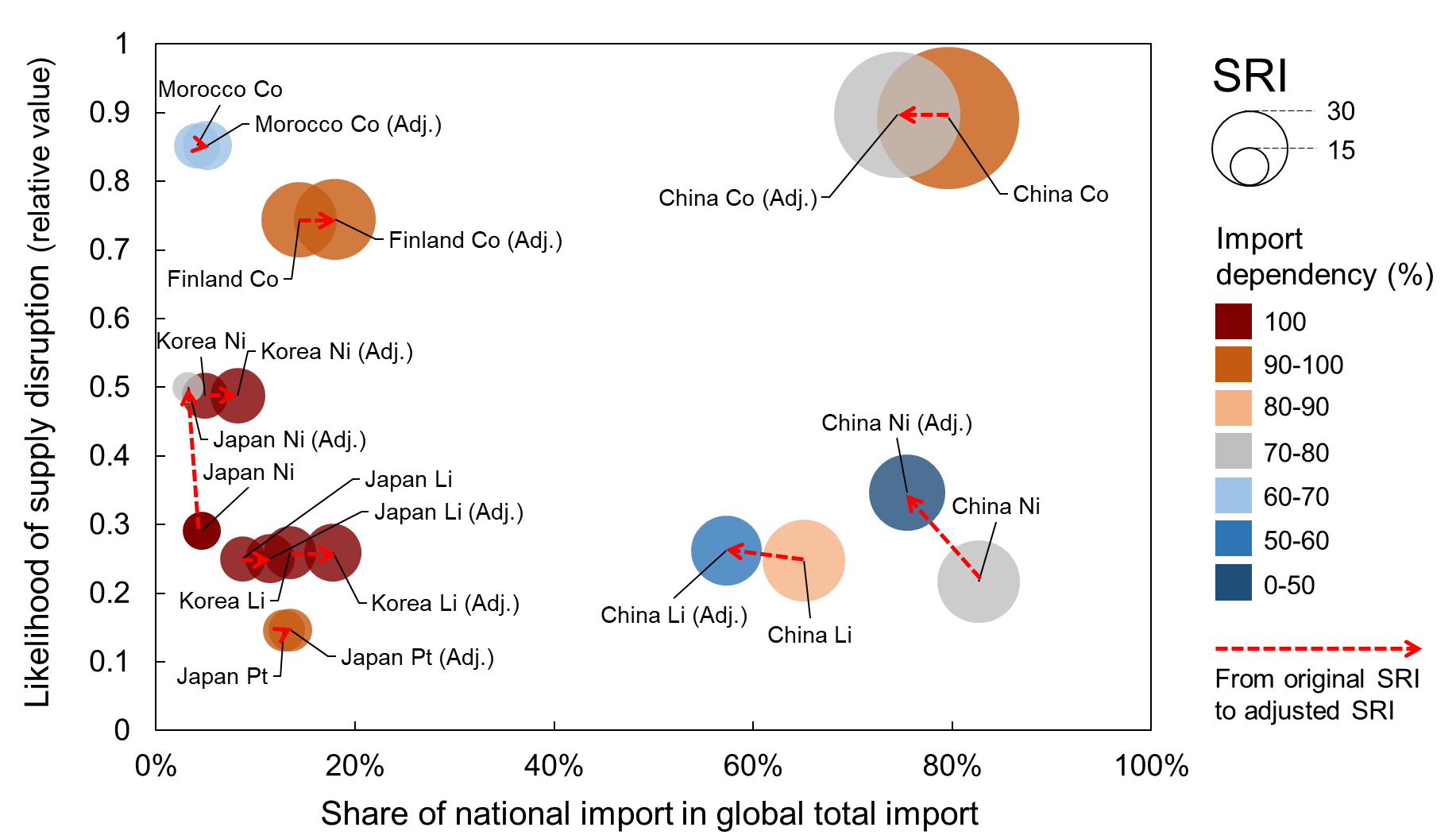 研究团队首先对交通低碳化相关的四类关键材料(锂、钴、镍、铂)建立了一个企业尺度高分辨率的全球矿冶生产控制数据库,全面厘清了矿山地理分布、运作管理和控股企业的控制力层级结构以及相关公司的国家隶属关系。团队进一步基于物质流分析的方法追踪了2019年在全球240个国家和地区中四种材料的全球生产和贸易网络,涵盖了矿冶和精炼两个材料代谢阶段。团队从地理分布和企业投资控制两个维度对关键材料的全球生产和贸易分布进行了二次刻画,并进一步提出了“地理-企业”双视角耦合的供应风险指数(SRI)这一原创方法,同时考虑进口依赖度、供给集中度、生产者稳定度等多维度影响因素,全面量化了全球各国面临的关键材料供应风险以及外国直接投资在风险缓解中的潜在作用。