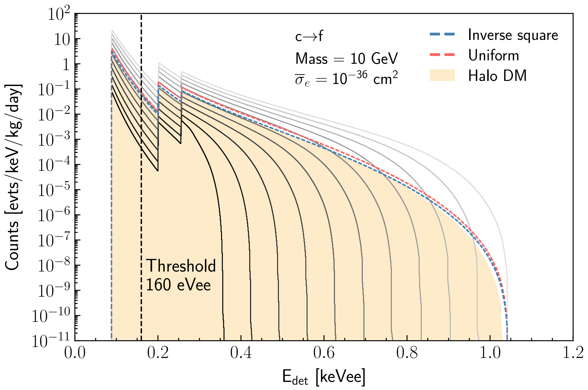 在利用暗物质-电子相互作用对加速暗物质进行分析时面临着一些问题。由于加速暗物质的速度分布多种多样,甚至是非解析的,在计算加速暗物质-电子相互作用事例率时就不能够再使用常规的解析计算方法,这意味着必须要进行非常复杂的数值计算,而巨大的计算量导致加速暗物质分析难以进行。为了解决这一问题,CDEX合作组提出了速度成分分析方法,对不同速度区间的贡献分别进行近似计算,实现了对加速暗物质-电子相互作用在半导体探测器上的快速分析。