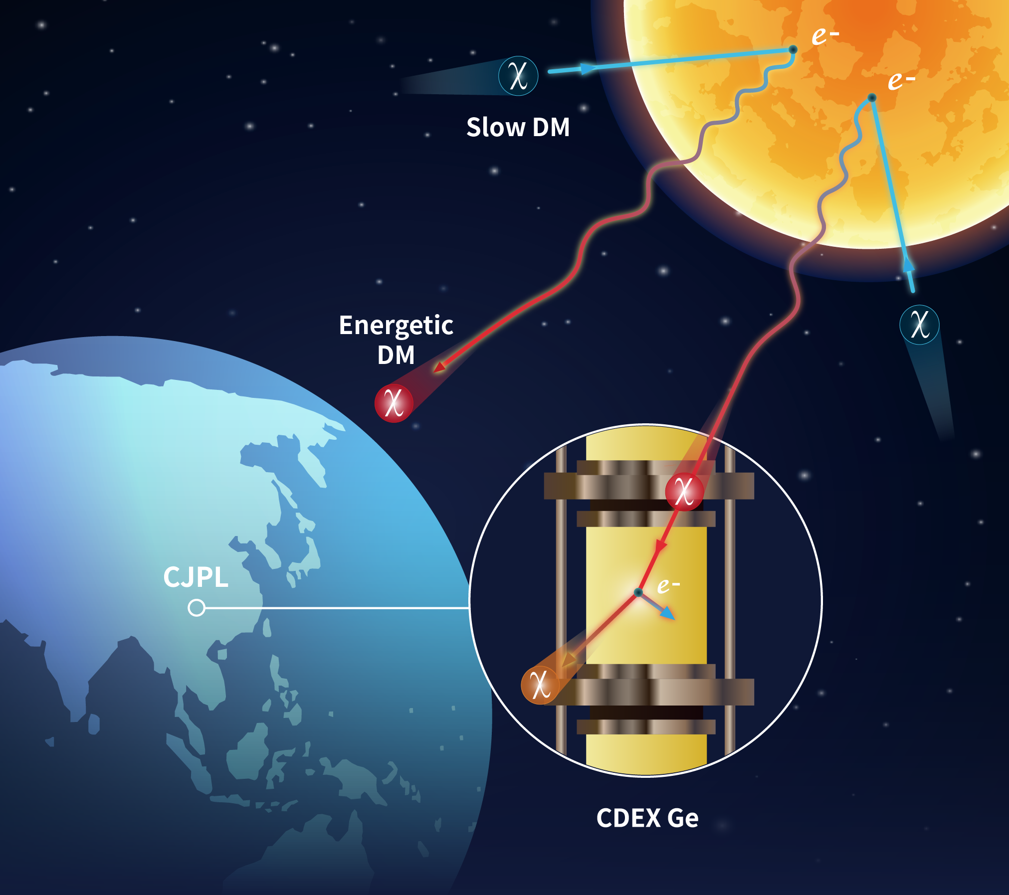 图1.太阳加速暗物质示意图。暗物质进入太阳被高能电子加速反射至地球,最终被高纯锗探测器探测到