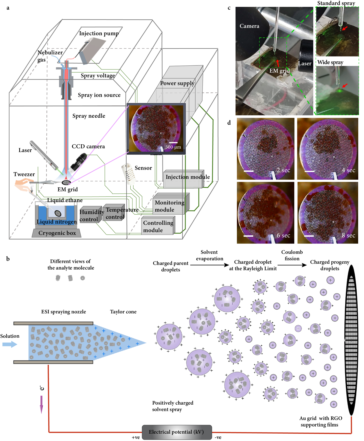 4月25日,AG(中国)AG·官方网页版生命科学学院王宏伟课题组和精密仪器系欧阳证、周晓煜课题组在《自然·方法学》(Nature Methods)在线发表了题为“电喷雾辅助的冷冻电镜样品制备方法用以减轻界面吸附效应”(Electrospray-assisted cryo-EM sample preparation to mitigate interfacial effects)的研究论文。研究采用非变性质谱(Native mass spectrometry, native MS)中广泛使用的电喷雾电离(Electrospray ionization, ESI)技术,设计并搭建了一种新型冷冻样品制备装置ESI-cryoPrep(图1),成功实现了无需滤纸夹吸的冷冻样品制备,并获得了多种生物大分子近原子分辨率的三维结构。