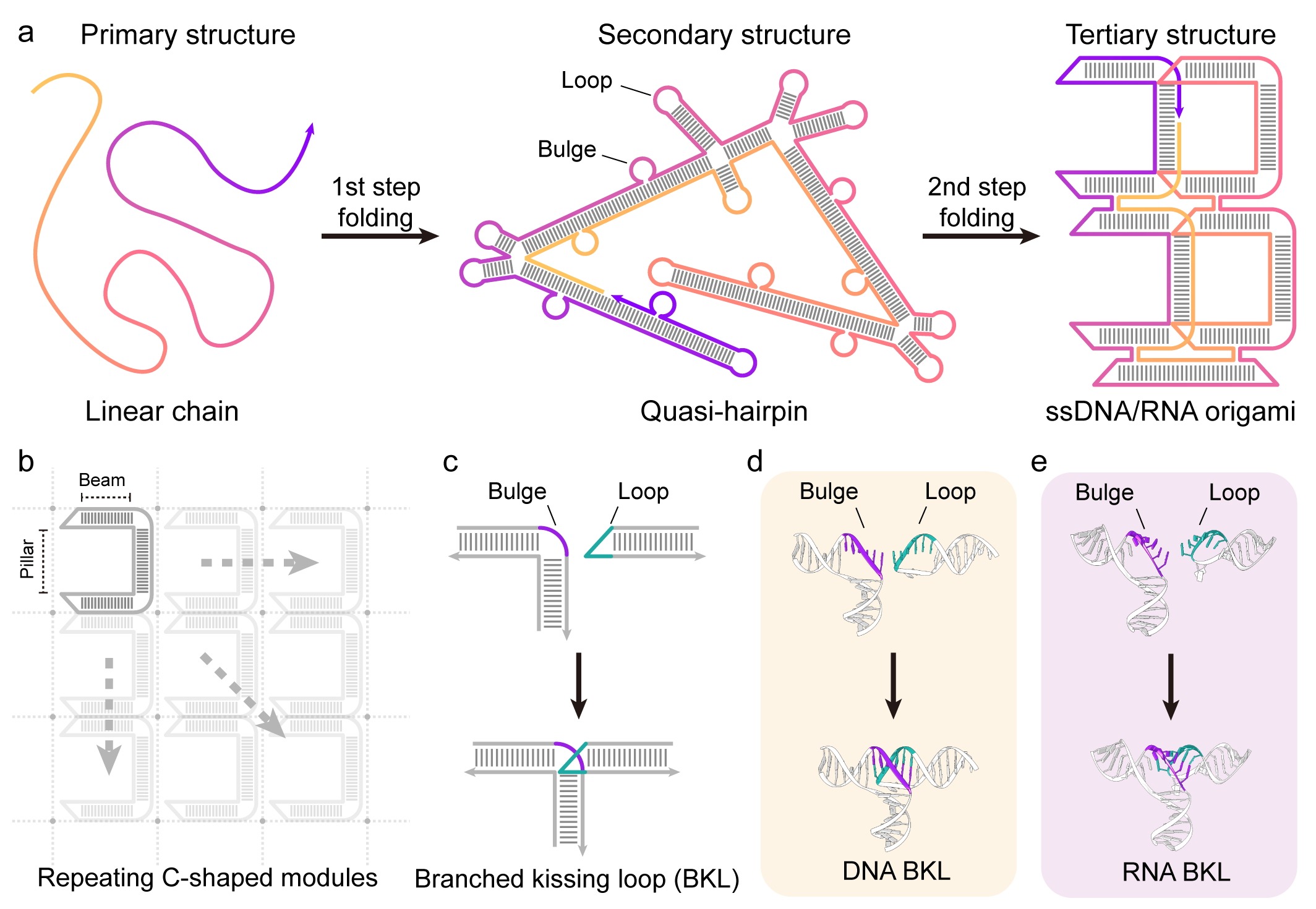 图1.利用分级折叠策略指导单链DNA/RNA进行折叠组装。(A)分级折叠过程示意图。(B)C形结构模块排布成预期网格状结构示意图。(C-E)BKL结构模块示意图
