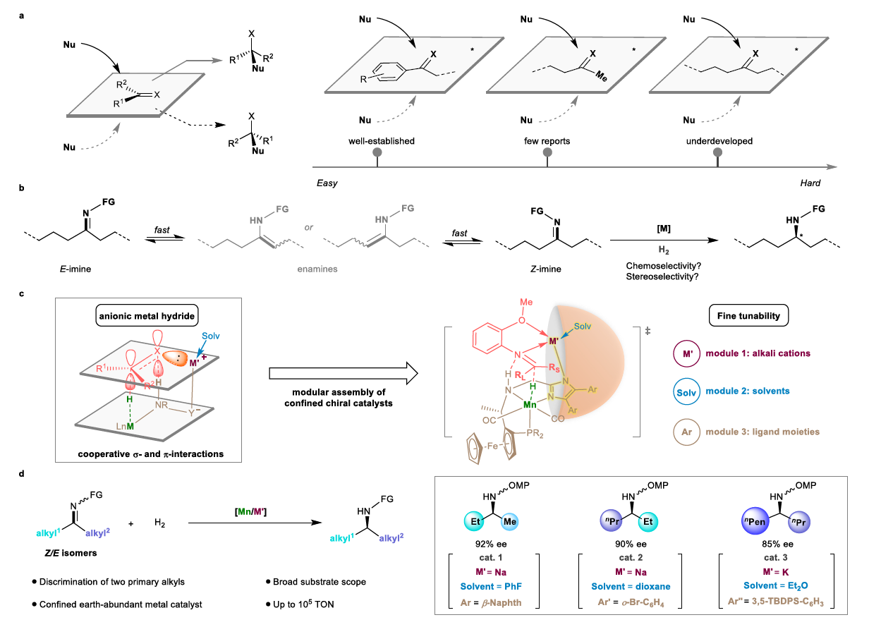 刘强课题组长期致力于开发高活性、高选择性的丰产金属氢催化体系及其合成应用。近年来,他们发展了基于协同效应的阴离子金属氢中间体催化转化新模式,展现出优异的反应活性和立体选择性。他们首次分离并表征了具有催化活性的胺基阴离子金属氢中间体,并发现此类新型中间体在惰性底物的催化氢化反应中展现出明显优于传统中性金属氢中间体的反应活性。在此前期工作基础上,并受到自然界中酶的精细限域结构及其与反应物之间多重次级相互作用的启发,最近他们设计了一类结构明确的手性丰产金属锰催化剂。通过以下两种方式显著提升了催化剂的反应活性和手性识别能力(图1b):1.通过构建阴离子型锰氢催化活性中间体,增强了其与底物之间的双重非共价相互作用,包括氢键和配位作用,从而利用σ-和π-协同活化模式有效增强了底物的亲电性和催化剂的手性诱导能力;2. 通过手性配体、金属阳离子及其溶剂化壳层的模块化组装,构建了一系列构型和尺寸精细可调的限域手性反应空间,展现出优异的手性识别能力。利用此催化体系,研究团队实现了微小差异烷基取代酮亚胺化合物的高效、高选择性不对称氢化反应,催化剂的转换数可达十万以上,达到了目前丰产金属催化不对称氢化反应的最高水平(图1c)。
