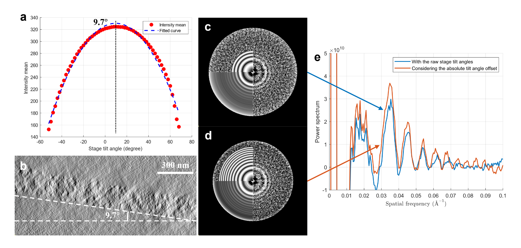 目前常用的离焦量估计方法通常依托图像功率谱中的CTF衍射环(Thon ring)进行估计。冷冻电子断层成像倾转系列图像信噪比非常低,且由于样品倾转引起照片中的离焦量随样品高度连续变化。这些因素导致高倾转角度下拍摄的电镜照片功率谱中没有清晰的CTF衍射环,导致难以精确估计样品的成像离焦量。此外,通过冷冻聚焦离子束(cryo-focused ion beam, cryoFIB)减薄方法制备的薄片样品与样品台之间常常存在一个十几度的夹角,称为绝对倾角偏移。该偏移会影响照片局域离焦量的估计,进而影响整体离焦量估计结果的准确性。